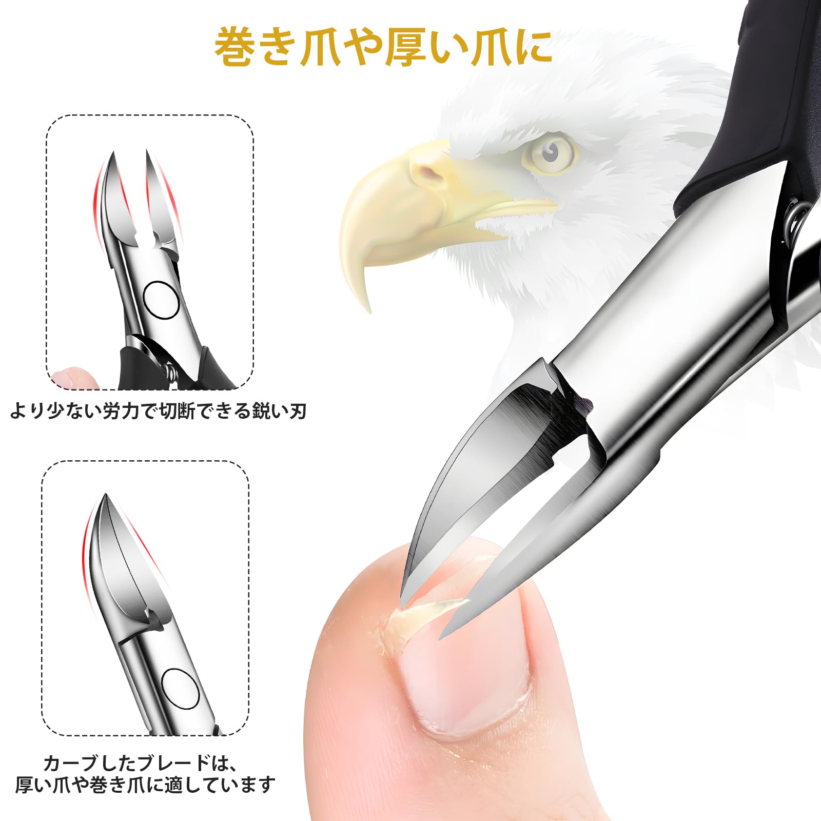 【足病専門爪切り】 巻爪や厚い爪のために設計された新型の鋭い湾曲刃で楽に切れます、爪を切るときのけがを防ぎ、爪の問題によって引き起こされる痛みを和らげます。鋭い先端は厚い爪/陥入爪/陥入爪/変形爪を簡単に手入れすることができます。