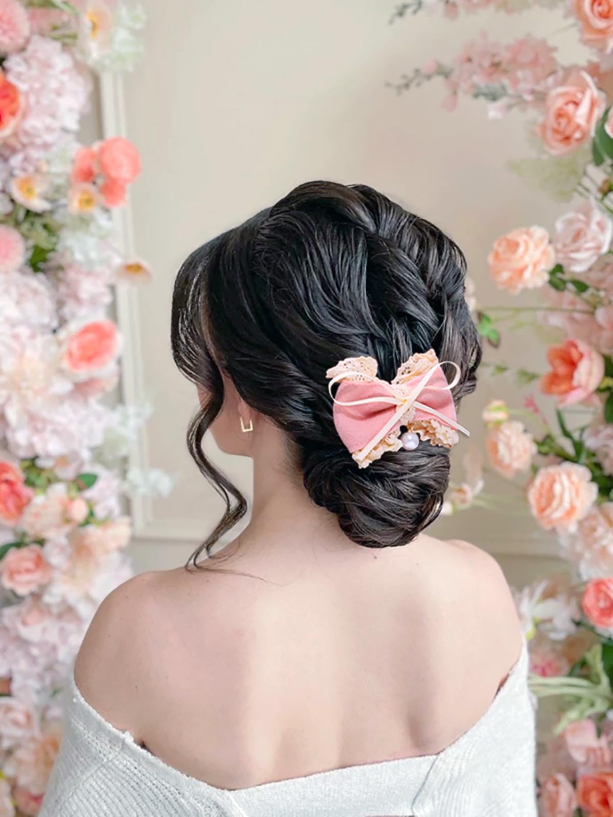 【高品質】リボンヘアクリップの耐久性と美観を確保するために、厳選された高品質のレースと合金素材。 縦約9cm、横約5cmのピンク色は、優しく上品な色合いです。