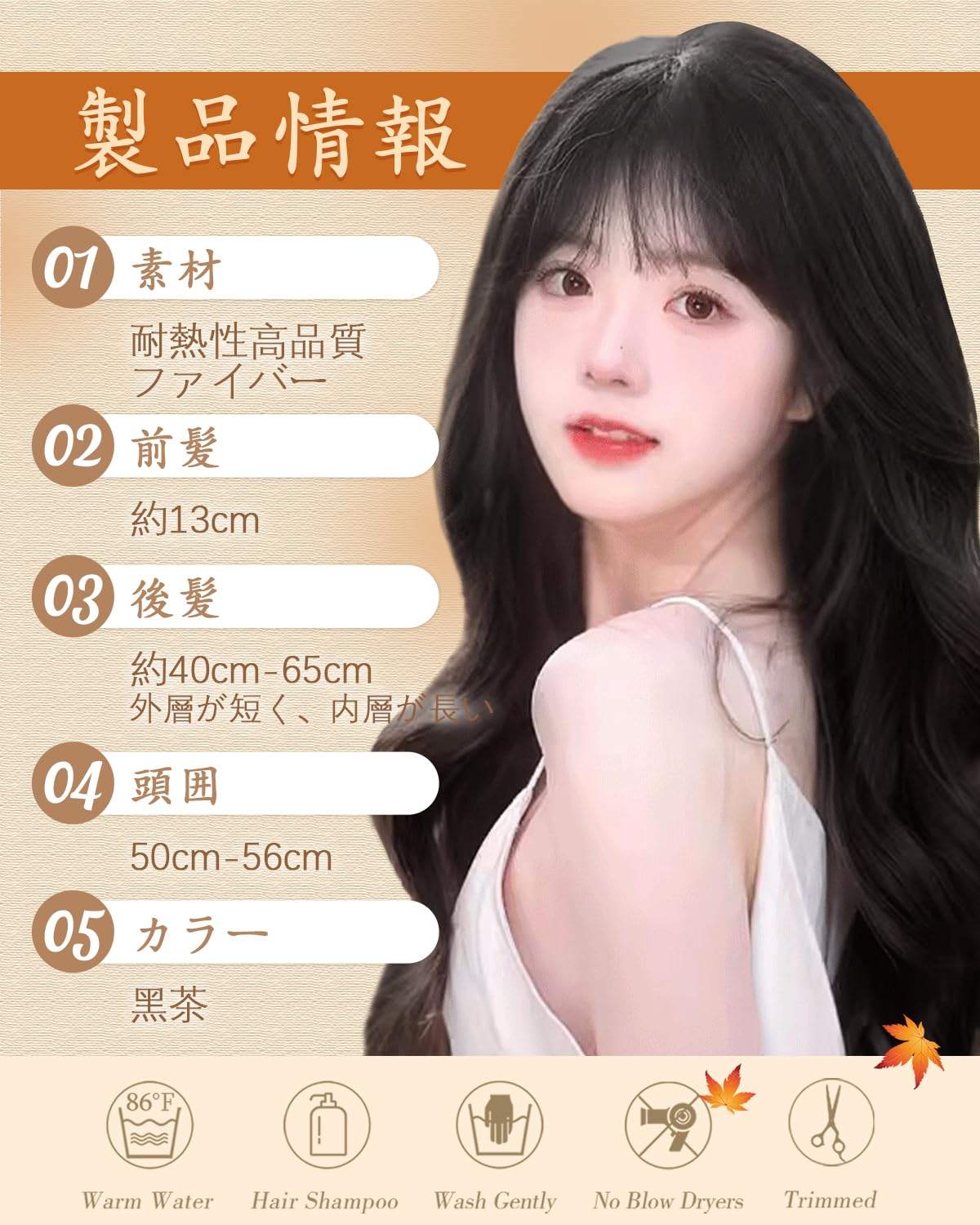 ❀【商品情報】①サイズ:前髪:生え際から毛先まで約13cm 後髪: 頭頂部から毛先まで約40cm-65cm(外層が短く、内層が長い) ②:頭囲約50〜56cmの方に適しています ③素材:高品質の耐熱繊維を使用し、160度までアイロンがかかるので、アイロン使用OKです ④カラー:黑茶 焦茶 丁字茶 鳩羽色 ⑤セット内容:ウィッグ+専用ヘアネット+前髪コーム(色ランダム)+説明書