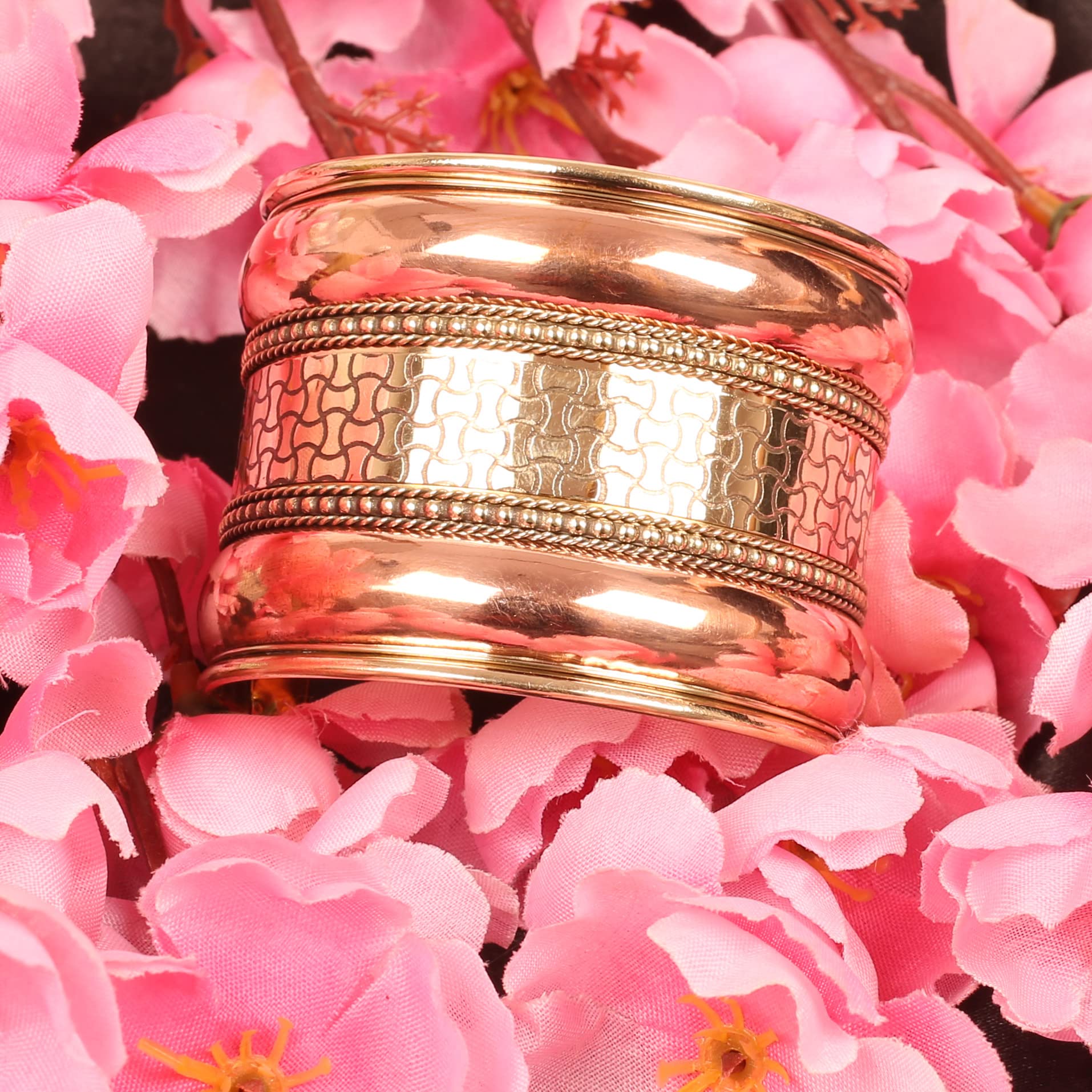 真鍮と銅のツートンカラーのゴージャスな幅広の袖口。 複雑な花の彫刻。 美しいデザインと細部へのこだわり。 インドの田舎の職人が何世代にもわたって受け継いだ技術を用いて手作りしています。 厚手で頑丈。 生涯お使いいただけます。