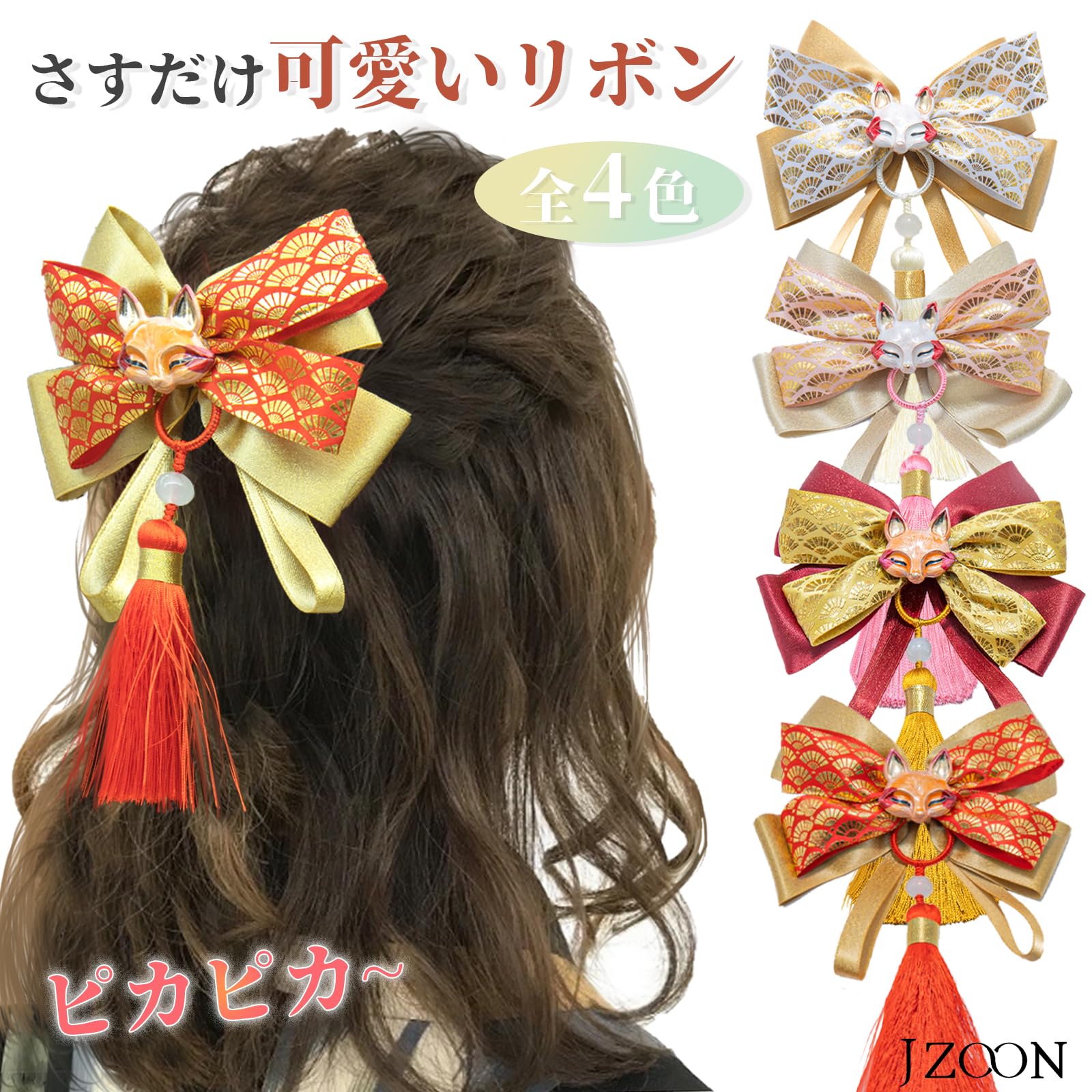 【かわいいリボン】キラキラと光沢のある滑らかなサテンからお手作りしたリボン髪飾りです。リボンはそれぞれ異なる柄のサテンで二重になっており、日本らしさを代表する狐面が真ん中についており、かわいさと神秘感をほどよいあらわしてくれます。タッセルが太い一本か細い二本で、歩きや風に揺れて、躍動感の溢れた一品です。