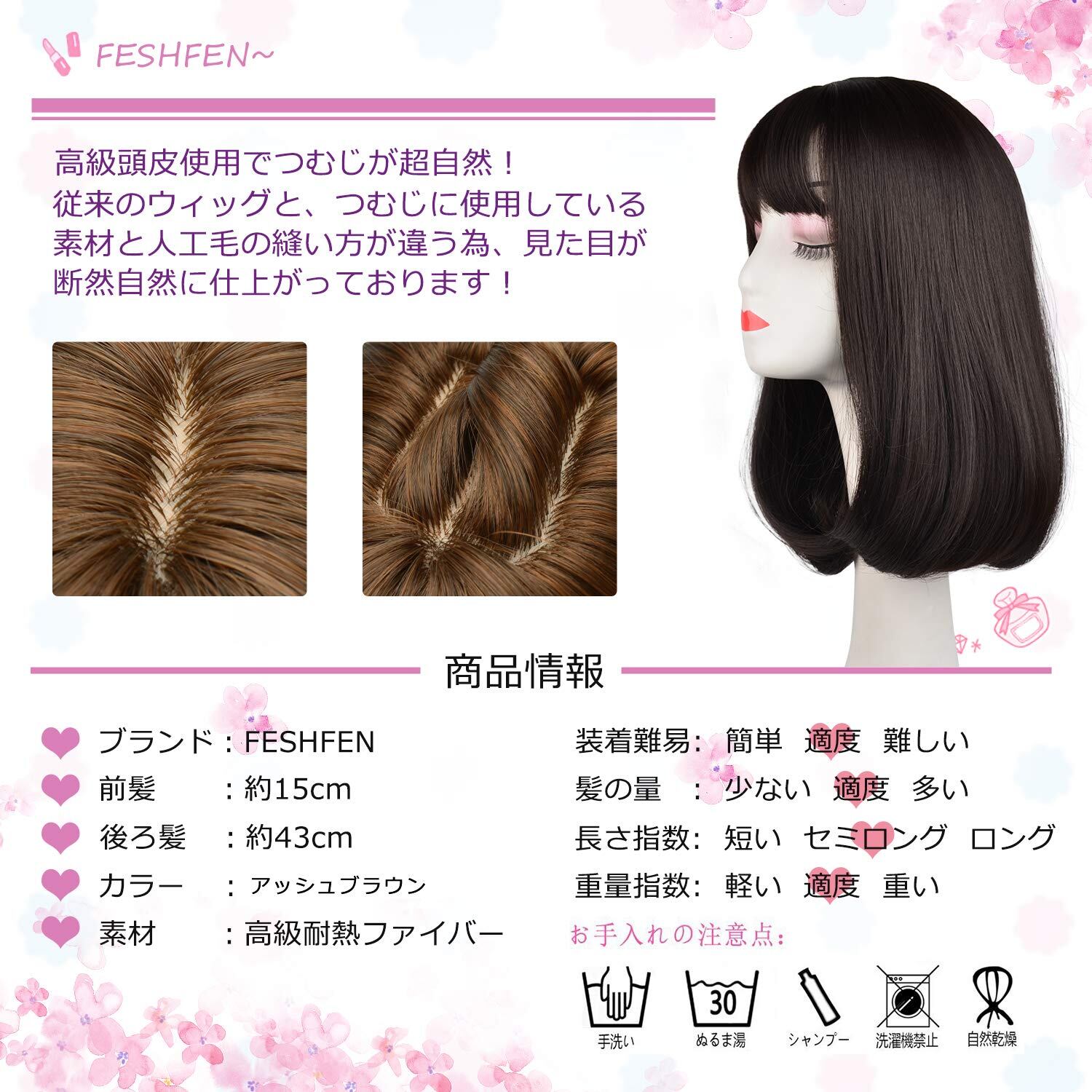 ⑤材質:高級耐熱ファイバー、高級人工頭皮使用により、光を自然に反射。ウィッグ特有のテカリはありません。手触りもしっとりナチュラル。コテ・アイロン・ドライヤーは160℃まで使用可能です。