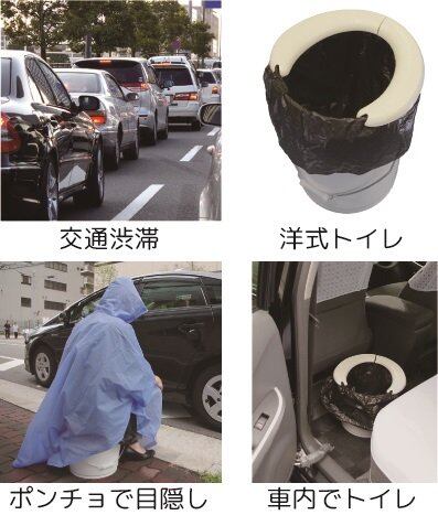 ●自然渋滞 ●自動車事故による渋滞 ●地震・土砂崩れ・大雪など、自然災害の立ち往生 このようなときに一番困るのは「トイレ」です。 次に必要なものは非常食・保存水と言われておりますので、 非常用品他も入れておくと安心・安全・便利です。 トランクが、非常用品備蓄場所にもなります。 こんな時に便利です。 ① ドライバーや同乗者が、急にトイレに行きたくなった時、車内でも、またポンチョを着れば外でも、どこでもトイレができ安全に安心して運転ができます。 ② 乗り物酔い、急な体調不良で気分が悪くなったとき、プラスチックの「ゆうぺーる」は膝の上で、洗面器の代わりに使用できます。 ③ 使用前に消臭抗菌凝固剤を入れておけば、汚物が臭わず固まりますので、一般ゴミとして処分できます。 *お子様、ご年配の方を連れての旅行を、安心して楽しめます。 *キャンプ、魚釣り、海水浴などのアウトドアのお供にも役立ちます。