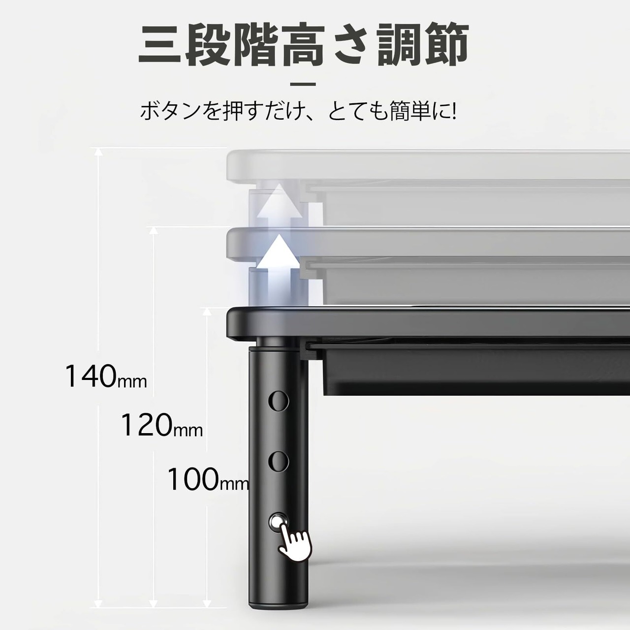 【製品仕様】天板の幅:36.8cm 奥行き:23.1cm 高さ:10-12-14cm三段階高さ調整可能。脚と脚の幅:35cm、奥行き:17.7cm 材質:スチール、最大耐荷重:20kg
