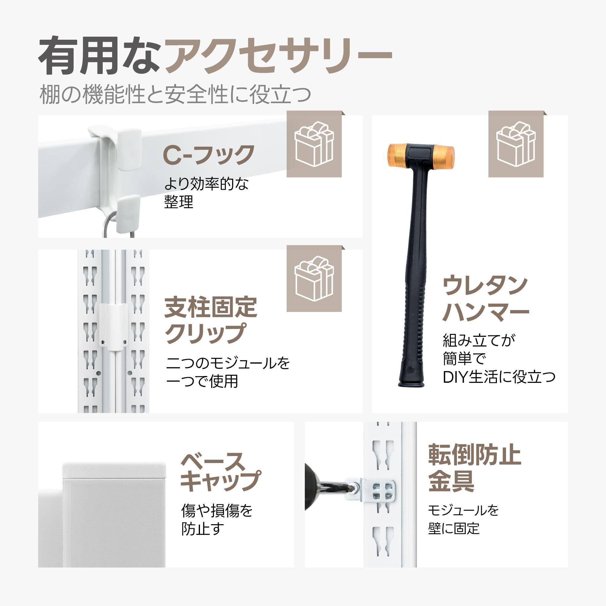 HOMEDANTだけの特典:基本のフラットな棚、縁付きBasketスタイルの棚、または2つのスタイルを組み合わせた棚(Basicのフラット+バスケット)にして棚を作成できます。そのため、さまざまな種類の物を収納できます。全ての購入顧客に特別なプレゼント(ウレタンハンマー、Cフック、支柱固定クリップ、転倒防止金具)を提供します。簡単に理解できるように組み立てマニュアルと動画も提供します。製品説明の一番下にある商品ガイドとドキュメントからユーザーマニュアルをダウンロードできます。