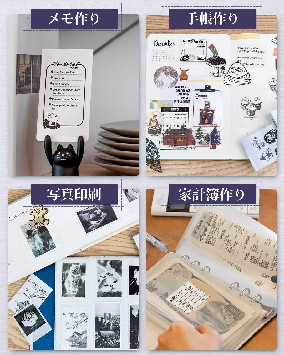 はっきり滑らかな解像度:203DPI解像度を持つ日本製プリントヘッドを内蔵し、クリアで綺麗な印刷効果を提供します。新しい画像とテキストの印刷エクスペリエンスをもたらし、白黒写真の印刷では、会議後にメモを取るのに適しています。写真、メモ、付箋、作業計画、会議メモなどに使用できます