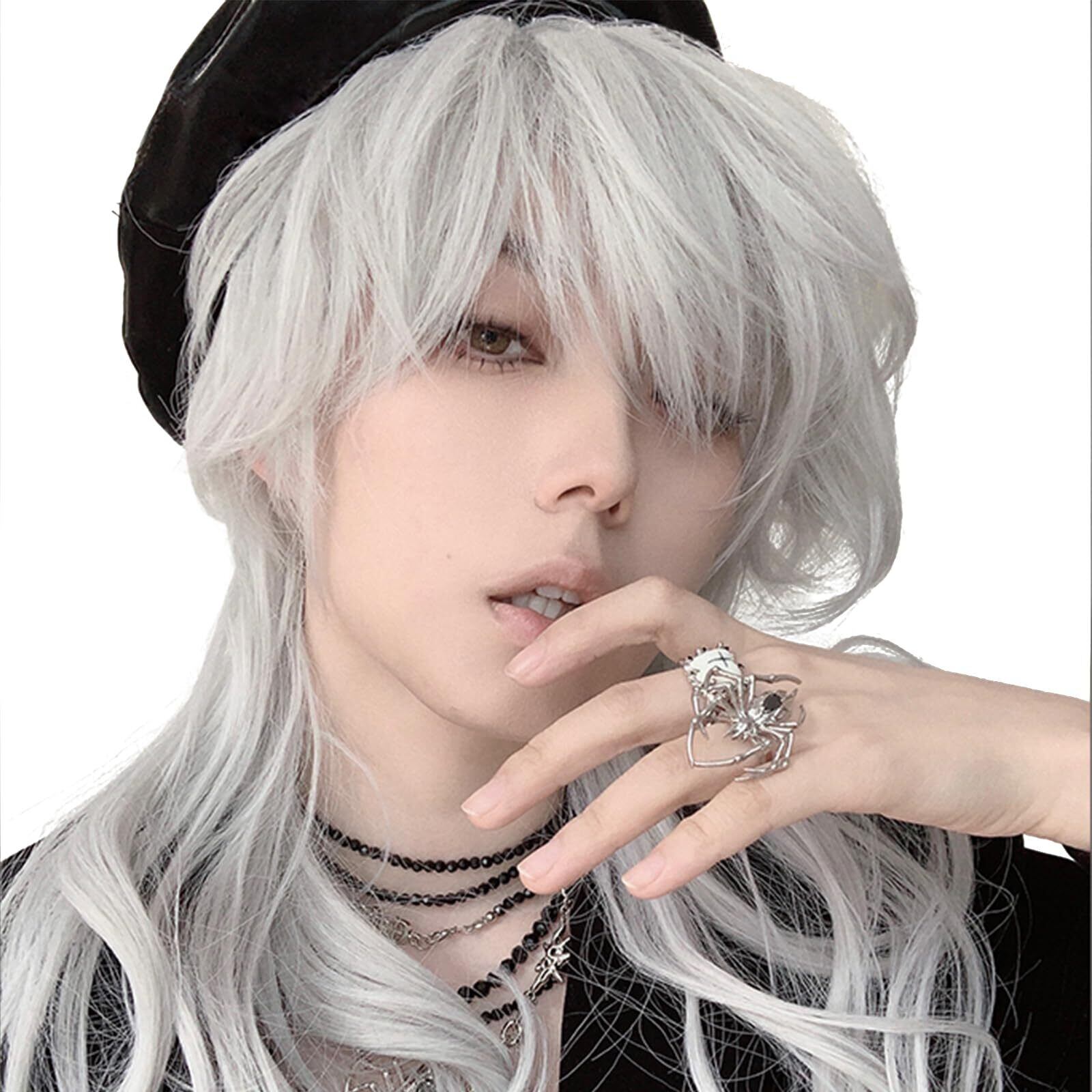 FESHFEN ウィッグ ウルフ メンズ ショート フルウィッグ ロング マッシュウルフ 男装 かつら 男性 うぃっぐ ウルフカット カツラ メンズ カール 原宿 イケメン ハンサム 自然 小顔 耐熱 ファッション イメチェン 男女兼用 ネット/櫛付き シルバーホワイト | Bloomia