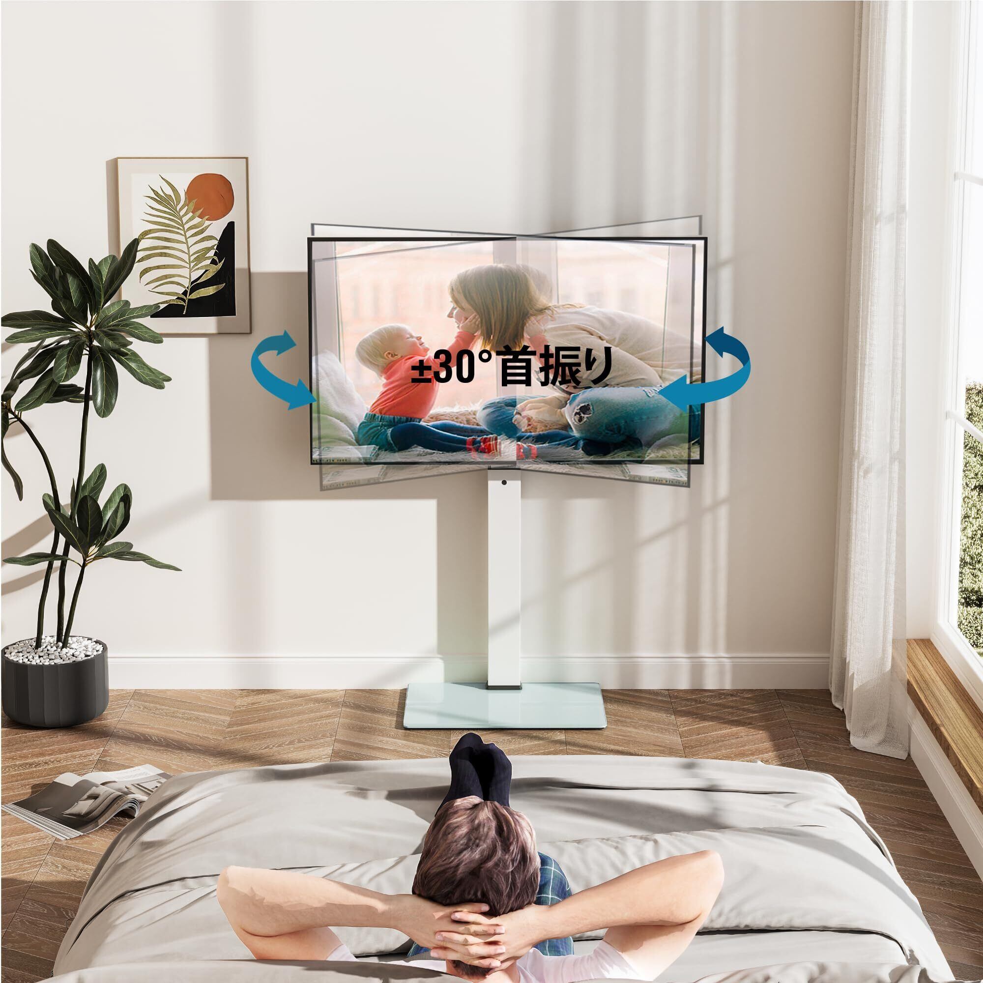 【高さ調整・首振り可】高さが金具と支柱の取り付け位置により、8段階の高さ(1224mm~1434mm)を選択して取り付けることができです。異なる身長のユーザーがテレビの高さに対する要求を完璧的に満たします。角度が左右方向へ各30°首振りできるので、最適な視角からの観賞を満たします。リビングルームやキッチン、寝室に居ても、回転角度によって、素晴らしい瞬間を見逃しません。