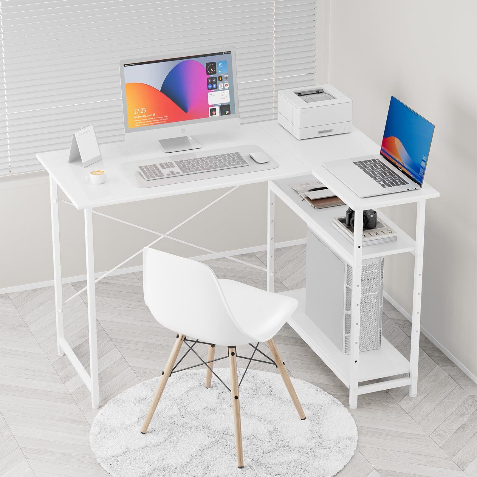 MIYOKI L字デスク パソコン デスク 幅110×奥行48×高さ75cm 左右入替え可能 l字型 コーナー ゲーミング 収納ラック付き 棚板高さ調節可 テレワーク 在宅勤務 学習机 省スペース ワークスペース ラック付き 作業机 シンプル オフィス (ホワイト) | Bloomia