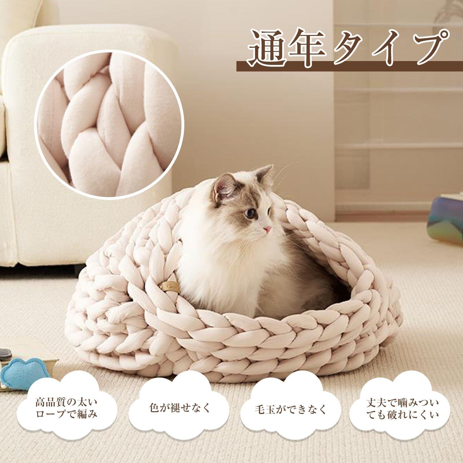 Alien Pet ペットベッド 猫ハウス おしゃれ 編み 犬ベッド ドーム型 ふわふわ クッション 編み糸 四季通用 洗える 猫犬兼用 太い芯糸 編み物ペット用品(ベージュ)