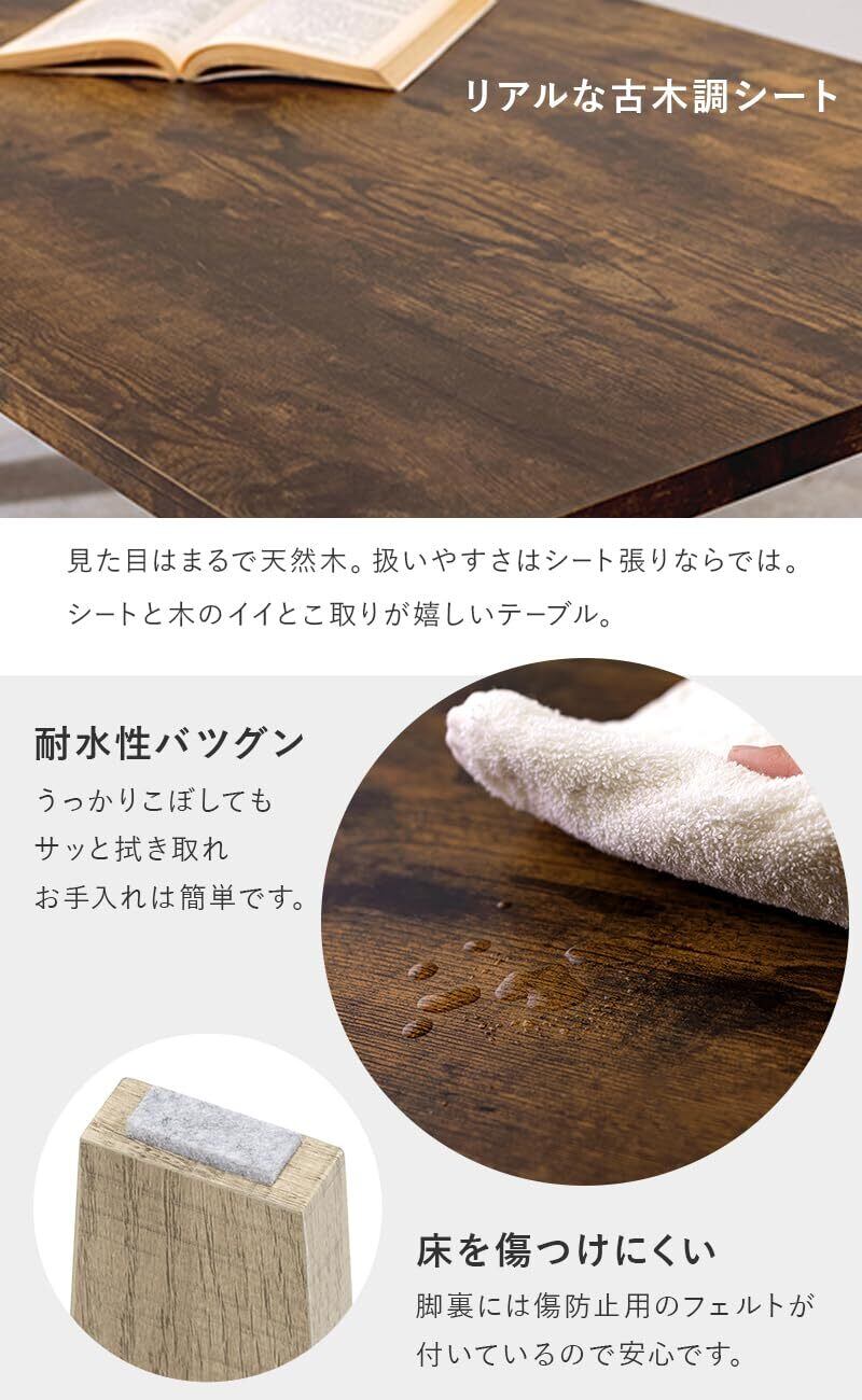 【ヴィンテージ感のある木目調ローテーブル】:リアルな古木調シートを天板に使用し、見た目はまるで天然木のように仕上げました。シートなので耐水性はバツグン。サッとふき取り、お手入れ簡単です。