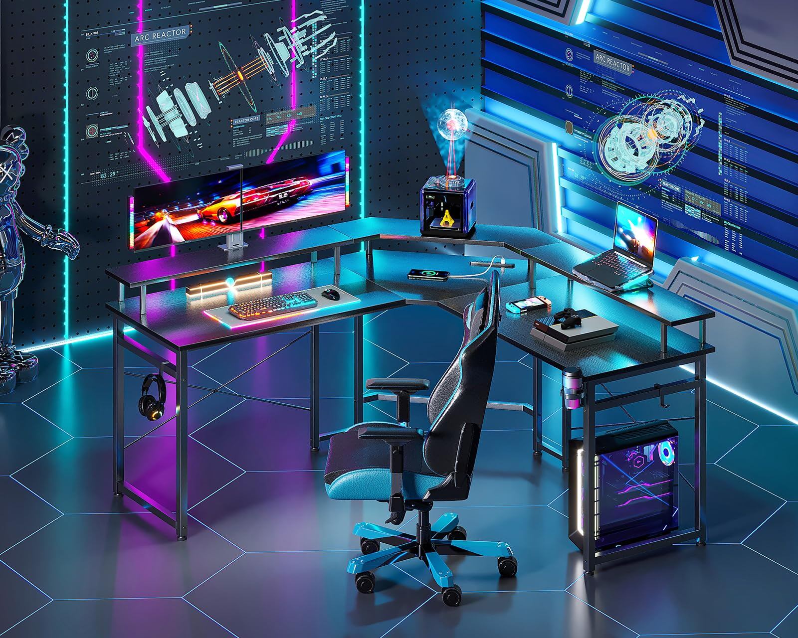 【コンセント付きL字デスク】机には、2つのACコンセントとUSB ポート付きで、パソコンやスマホなどの充電ができて超便利です。また、デスクの上には一体型のモニター台が備え、利用時に目線をあげて姿勢を改善し、首や肩への負担を軽減!長期間のeスポーツゲームもテレワークも快適に!広々の天板で、圧迫感なく作業効率も格段に上がります。ヘッドホンフック、ドリンクホルダーあり、ゲームと作業スペースがアップ、もっと楽に楽しめます。