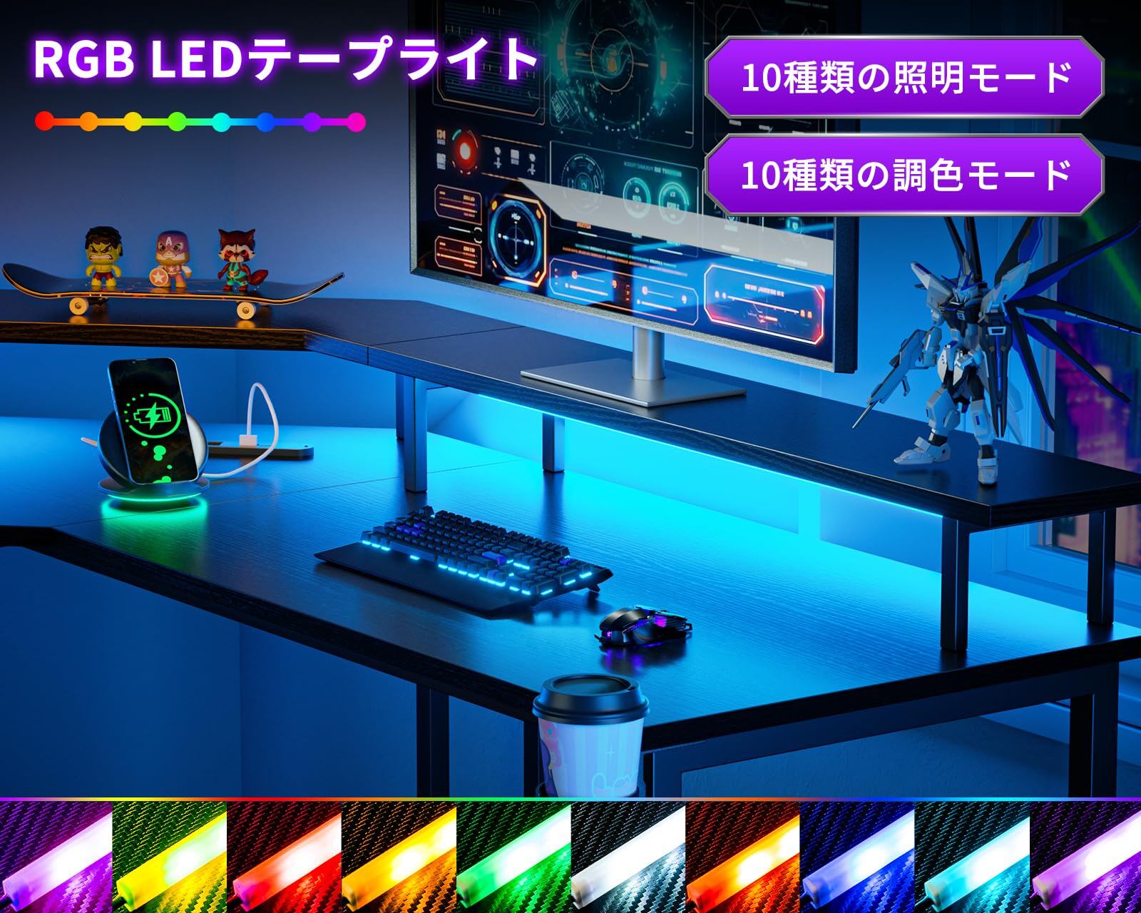 【LEDライト付きゲーミング机】デスクには、RGBライトを搭載しており、気分やシーンに合わせて色を切り替えることができます。10種類の照明モードと調色モードで、ゲーム環境の没入感をより高められます。ライトをオンにした時に最後のモードを維持するメモリー機能を備えています。毎日好きな色とモードを選択して、臨場感あふれるゲーム雰囲気を作り出します。