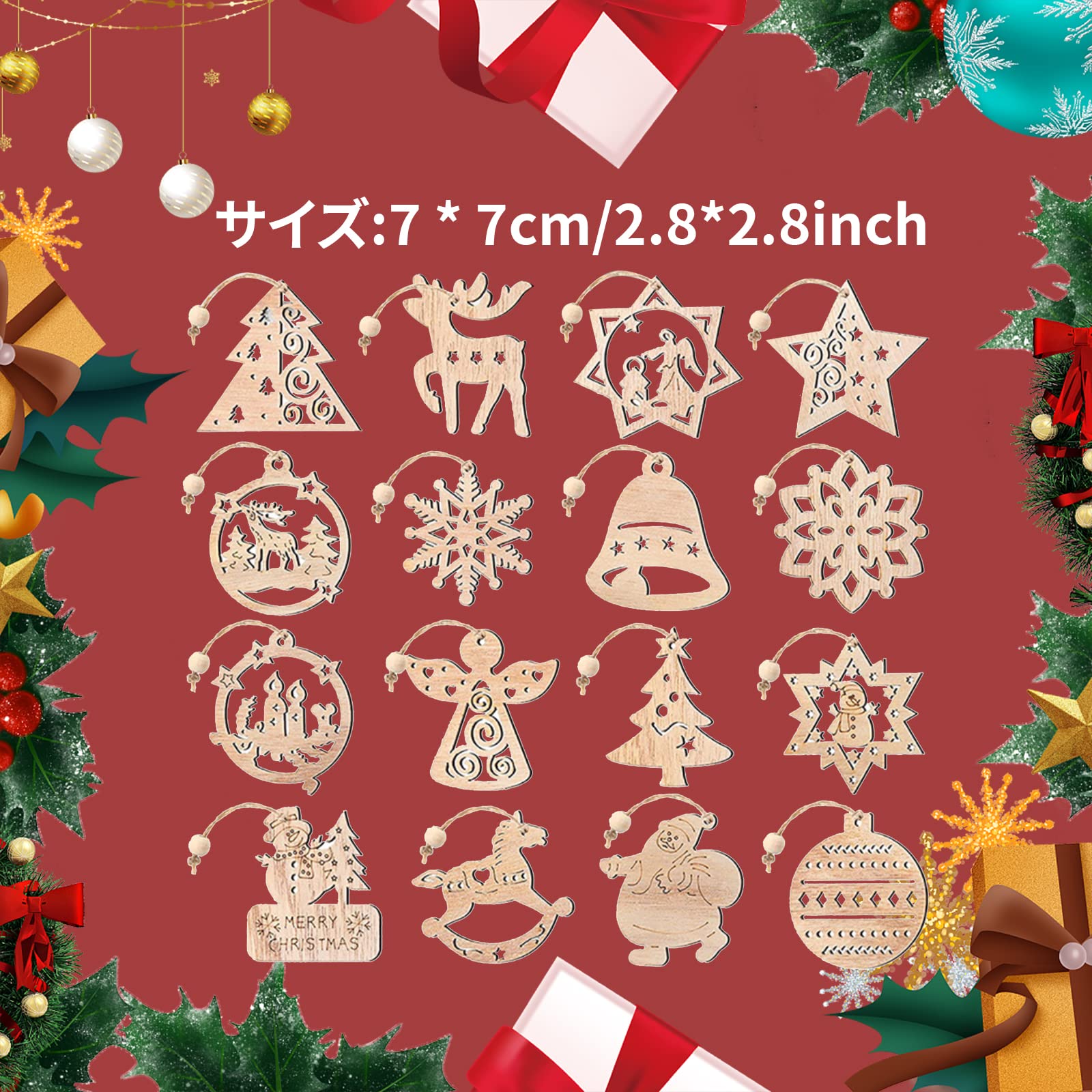 【クリスマスツリーオーナメント】クリスマスツリーを飾る木製オーナメントセットです。クリスマスツリー、サンタ、雪の結晶、トナカイ、雪だるま、天使、ベルなど16種類のデザ、インがあります。