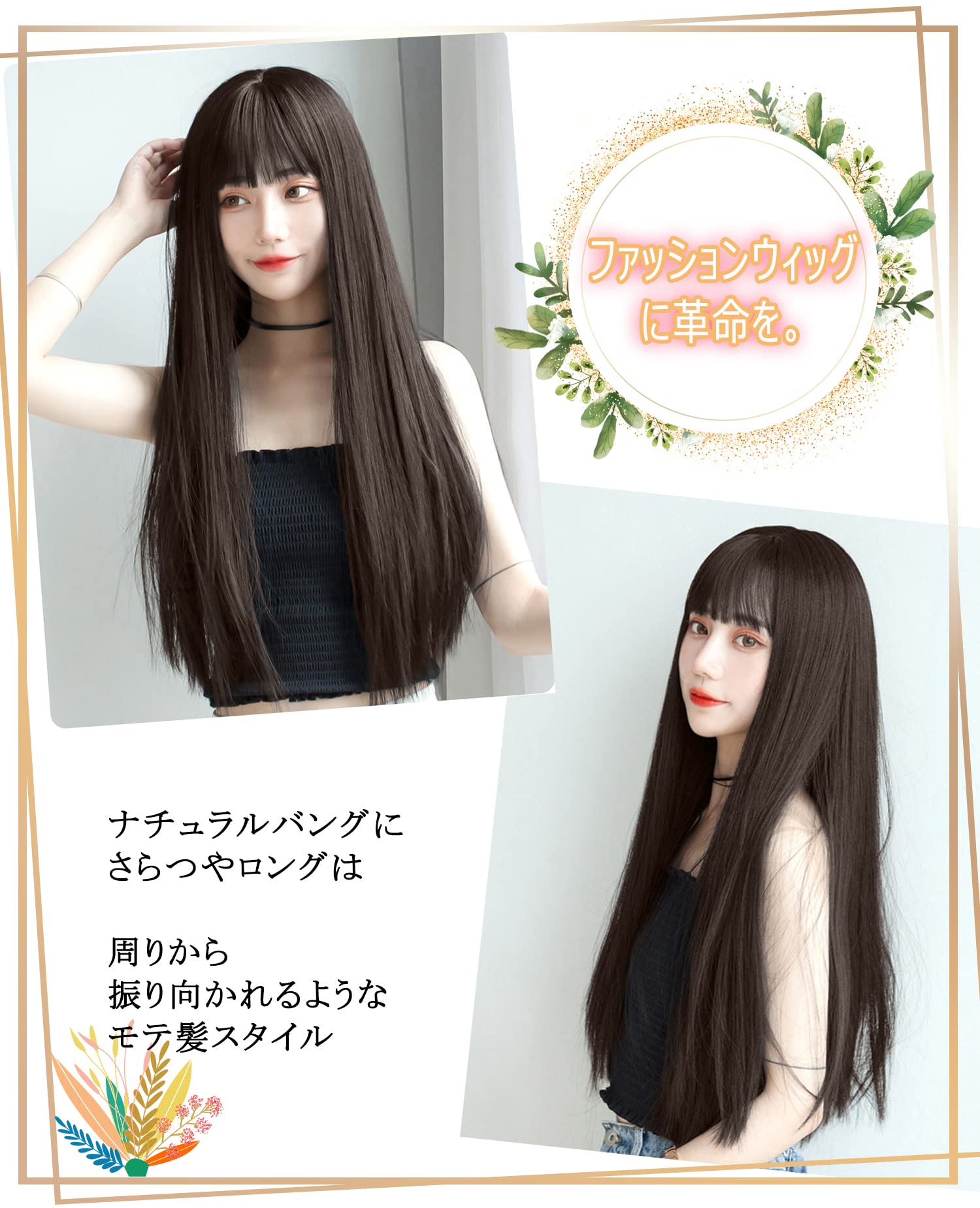 ウィッグ ロング ストレート かつら フルウィッグ 自然 コスプレ ぱっつん 小顔 人気 耐熱 wig 原宿系 ファッション ネット/櫛付き (アッシュブラウン)