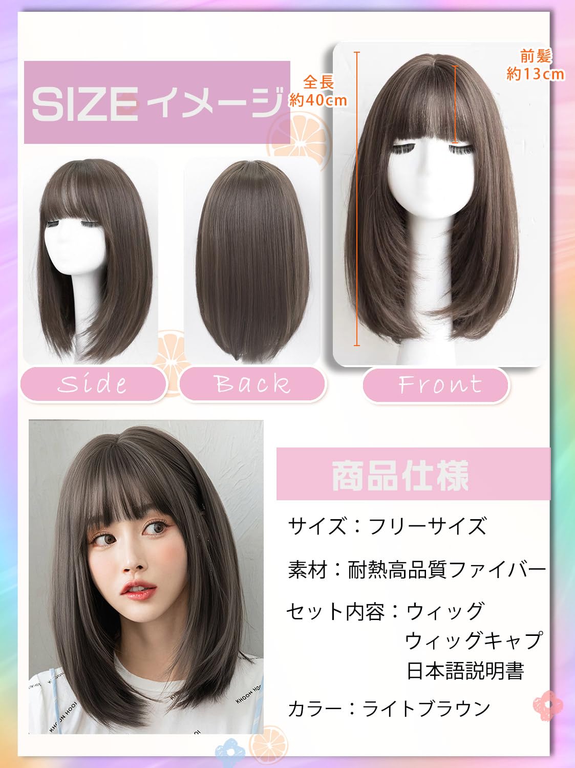 【ウィッグサイズ】:①前髪:つむじから約13CM,後ろ髪:つむじから約40CM。②頭周り:最大約56~58㎝、アジャスター付きなので、個々の頭の大きさに合わせて段階調節することができます。③カラー:ライドブラウン④素材:高品質耐熱ファイバー。⑤同梱内容:ウィッグ/ウィッグネット/日本語使用説明書