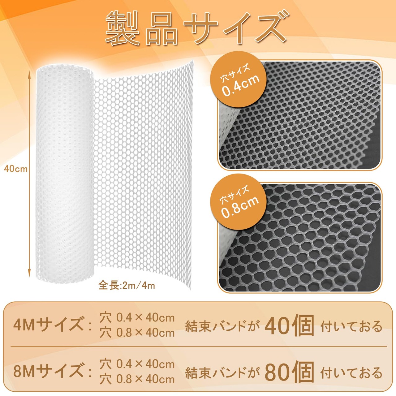 【豊富なサイズバリエーション】 0.4cm穴40cm×4m 0.4cm穴40cm×8m 0.8cm穴40cm×4m 0.8cm穴40cm×8m からお選び下さい。結束バンドが4mには40個、8mには80個付いております。お客様のニーズに合わせて、製品をお選びください。