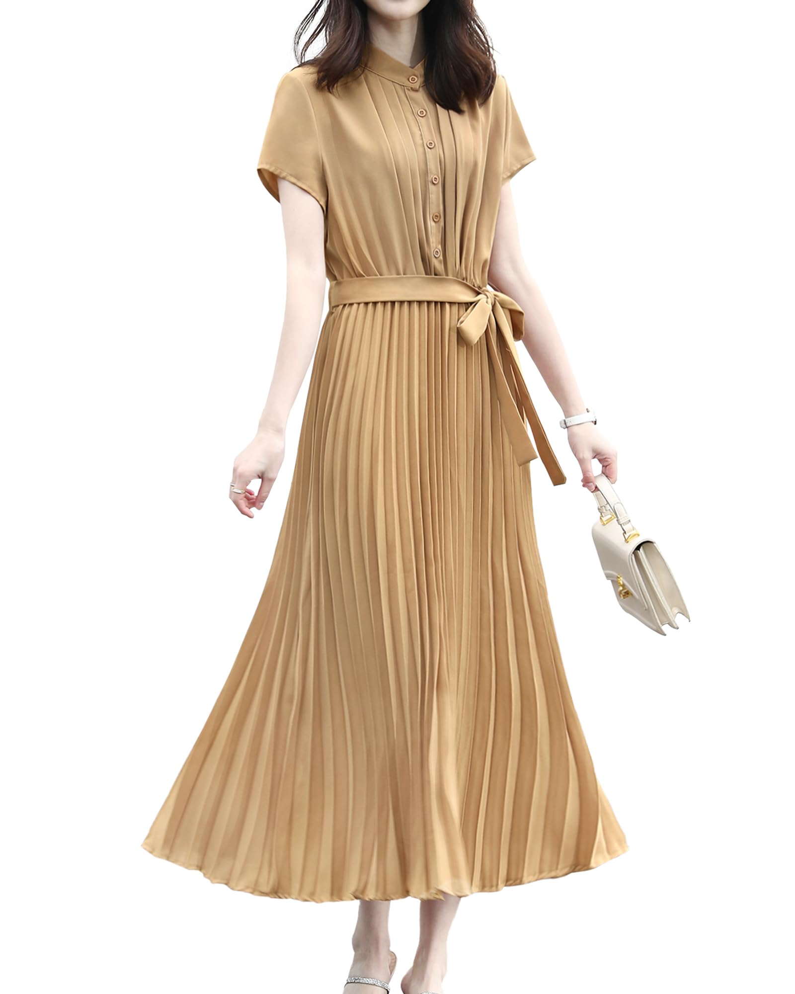 ●こだわりのプリーツデザインがアクセントになって、風にゆらゆらと幾重に重なった波のように、ロマンチックな雰囲気を作り出してくれるワンピースです。爽やかで通気性に優れたシフォン素材で夏のクールコーデには欠かせない一枚です。メリハリのあるシルエットでスタイリッシュな印象になり、体型をカバーする効果も期待できて嬉しいです。程よい半袖丈で二の腕をカバーしてくれて、夏のそよ風が吹いてくると周りも涼し気で、夏でも爽やかに着られるワンピースです。
