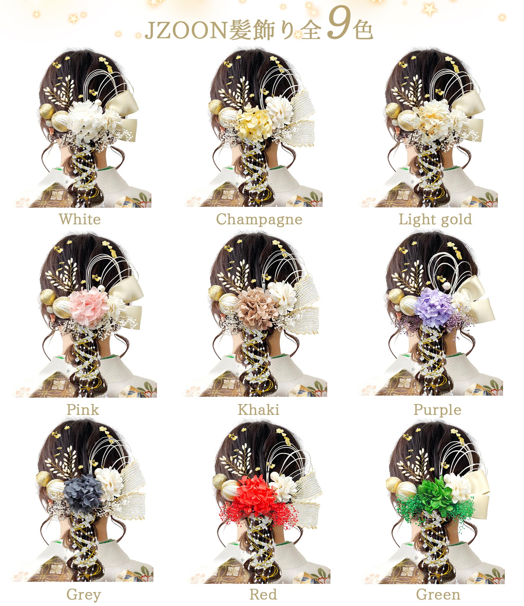 [JZOON] 髪飾り 9色展開 成人式 髪飾り ドライフラワー 袴 卒業式 和装 結婚式 振袖 プリザーブドフラワー 金箔 紐アレンジ 水引 和玉 A1600