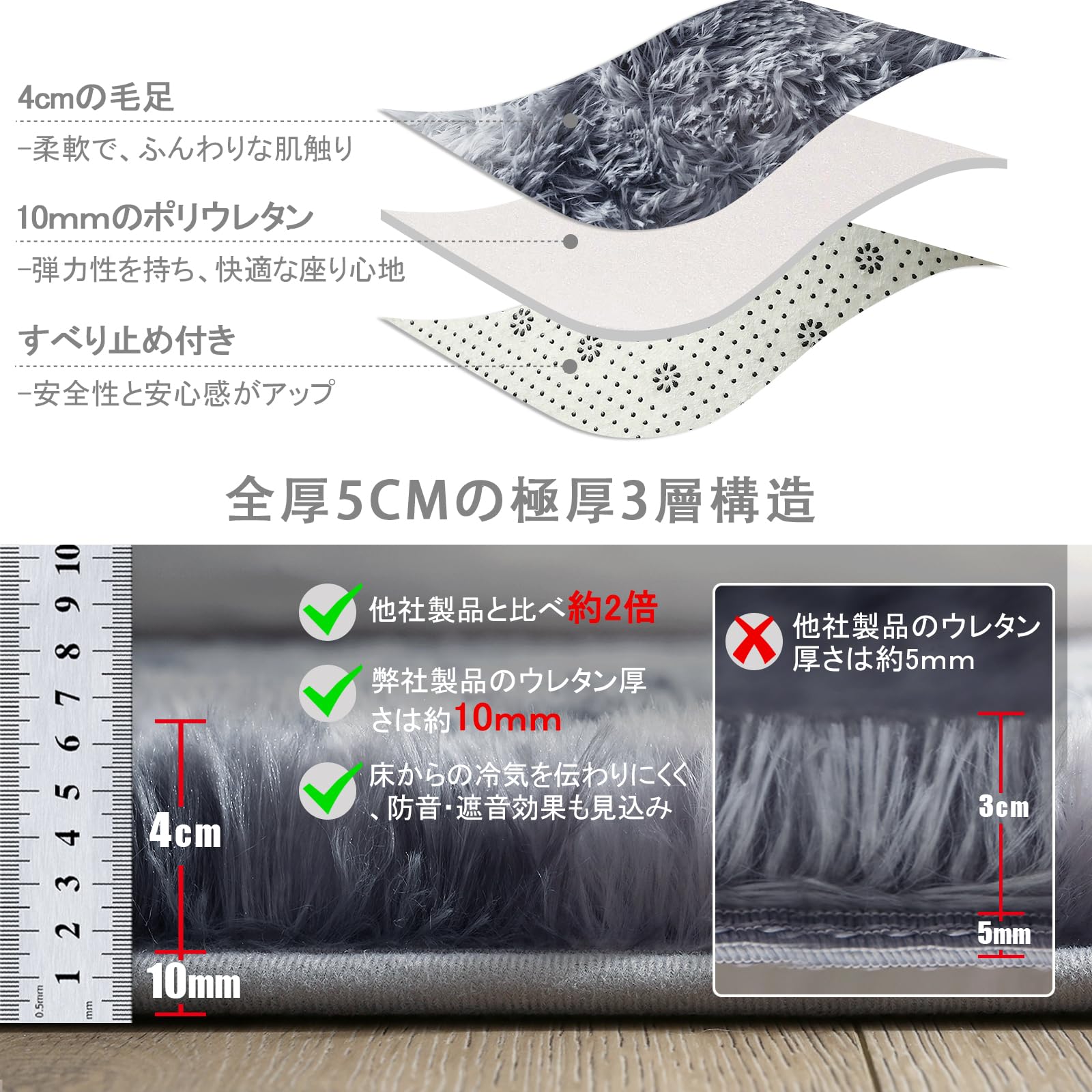 【厚手版仕様】サイズ:120x160cm 、重量1.1KG。①毛足の長さ:約40mm ②ポリウレタンの厚さ:約10mm(他社より5mm厚い)③裏地:不織布(滑り止め付き) 。弾性が抜群、防音効果が優れます。