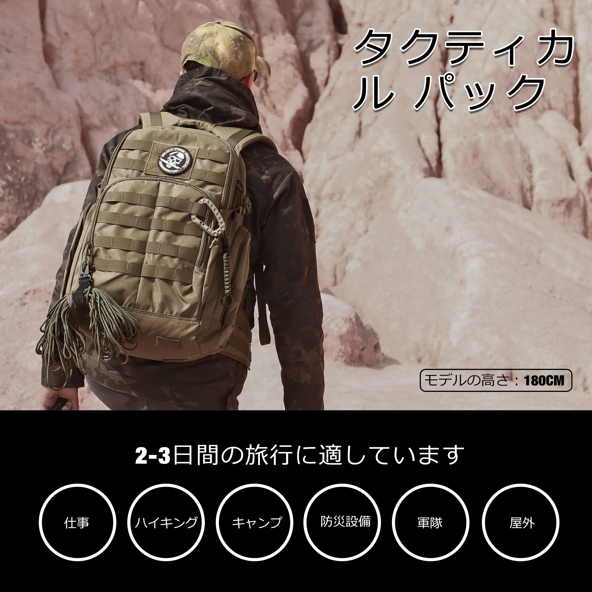 【リュック仕様】容量:40L。長39x高51x幅24cm。このミリタリーバックパックは600D耐水性ポリエステルで作られています。 YKKジッパー。