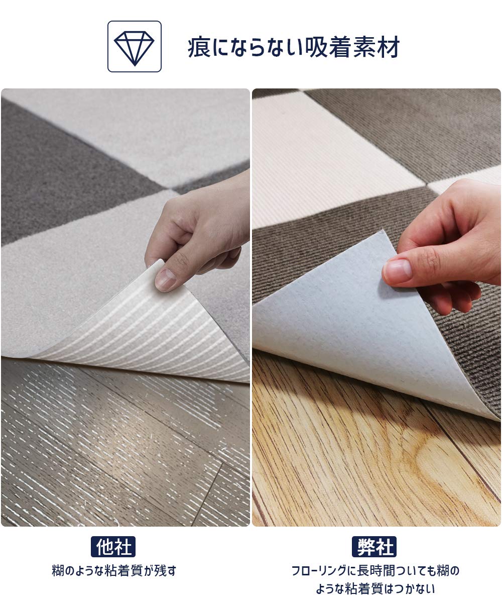 【ずれない 吸着タイルカーペット】空気が抜け真空状態になって無数の吸盤ができたようなくっつく仕組みだから、動き回ってもマットはズレません。厚み約4mmのマットですので、つまずきにくく、扉の開閉の妨げにもなりません。引っ掛かったりする恐れが少なくなる。高齢者や老犬は足腰が弱くなり、滑り止め対策として良いものです。