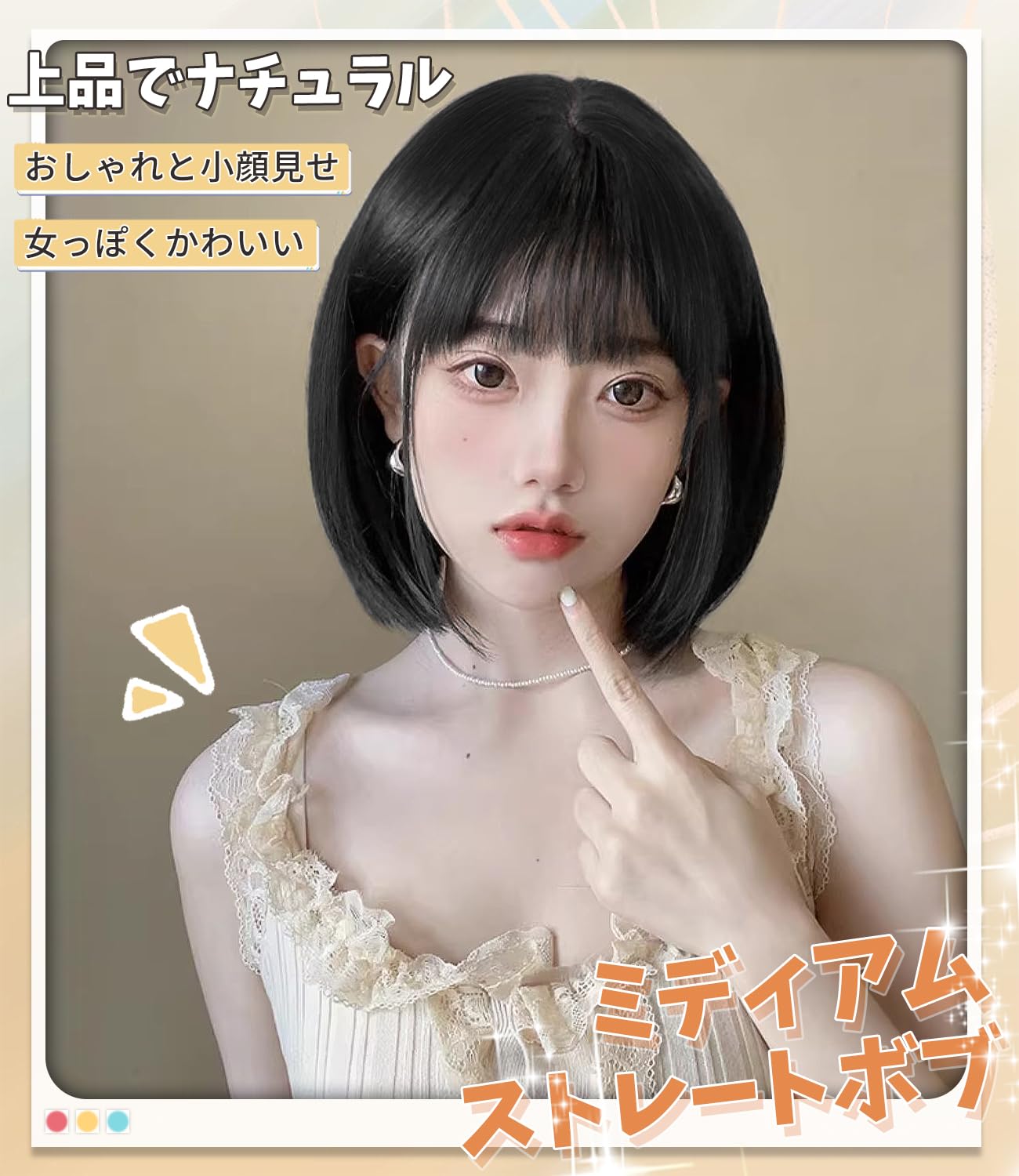 「丁度いい長さの王道ボブ」シンプルで美しい無造作な雰囲気を作り出すストレートボブウィッグです。洗練されたシルエットが可愛さと大人っぽさ、どちらも演出しやすいです。ぱっつん前髪が愛らしさを引き立て、小顔効果抜群です。