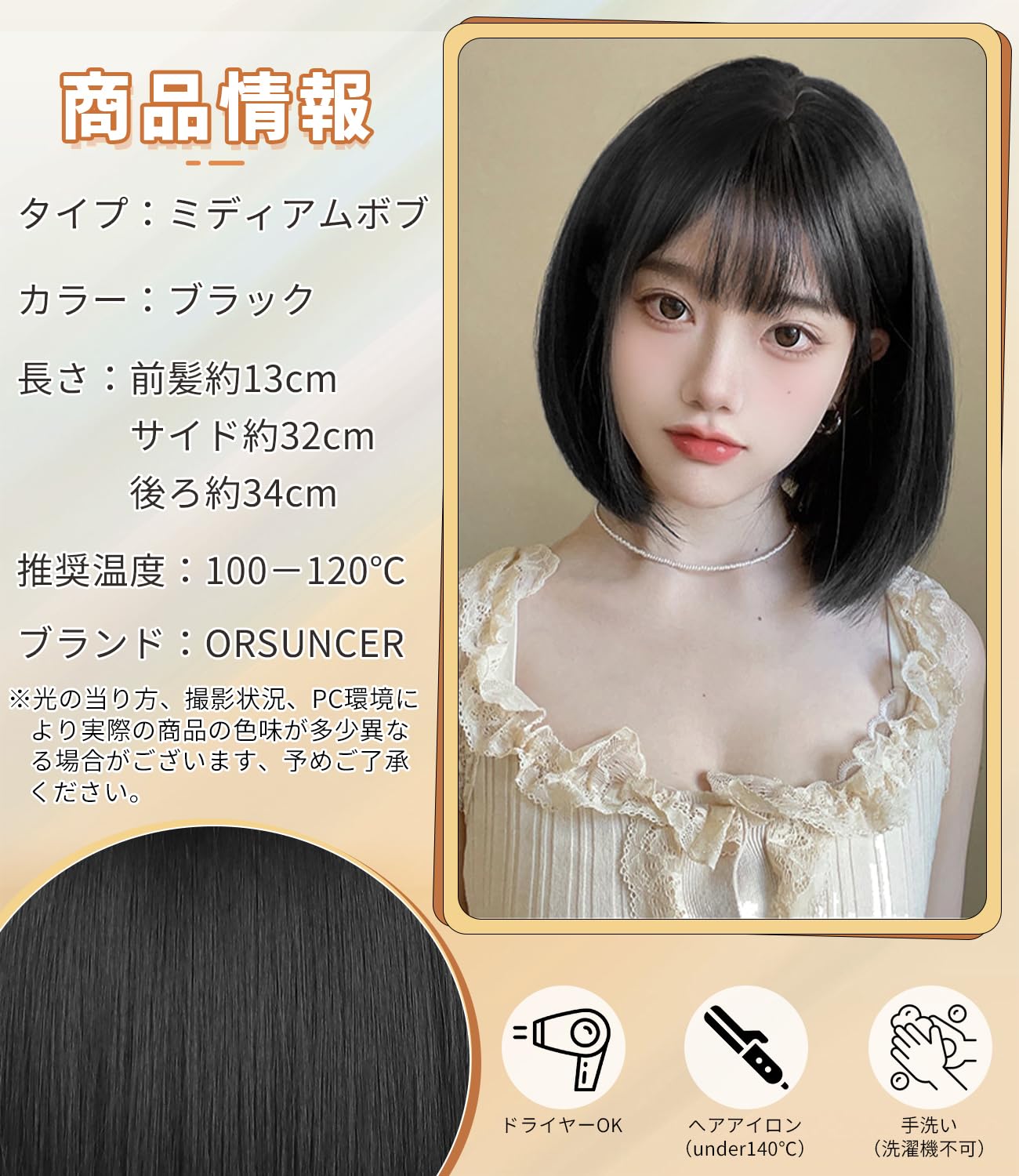 「素材」高品質耐熱ファイバー。ドライヤー、コテ、アイロン、カットなどでヘアアレンジ幅広いが可能です。推奨温度:100~120 ℃。ウィッグのテカリ感を抑えて人毛に近いサラサラの髪質です。