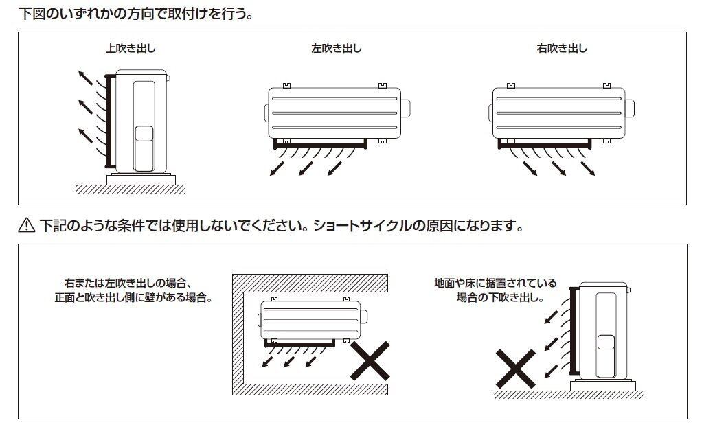 右または左吹き出しの場合、正面と吹き出し側に壁がある場合は使用しないで下さい。ショートサイクルの原因になります。地面や床に据置されている場合の下吹き出しの場合は使用しないで下さい。ショートサイクルの原因になります。