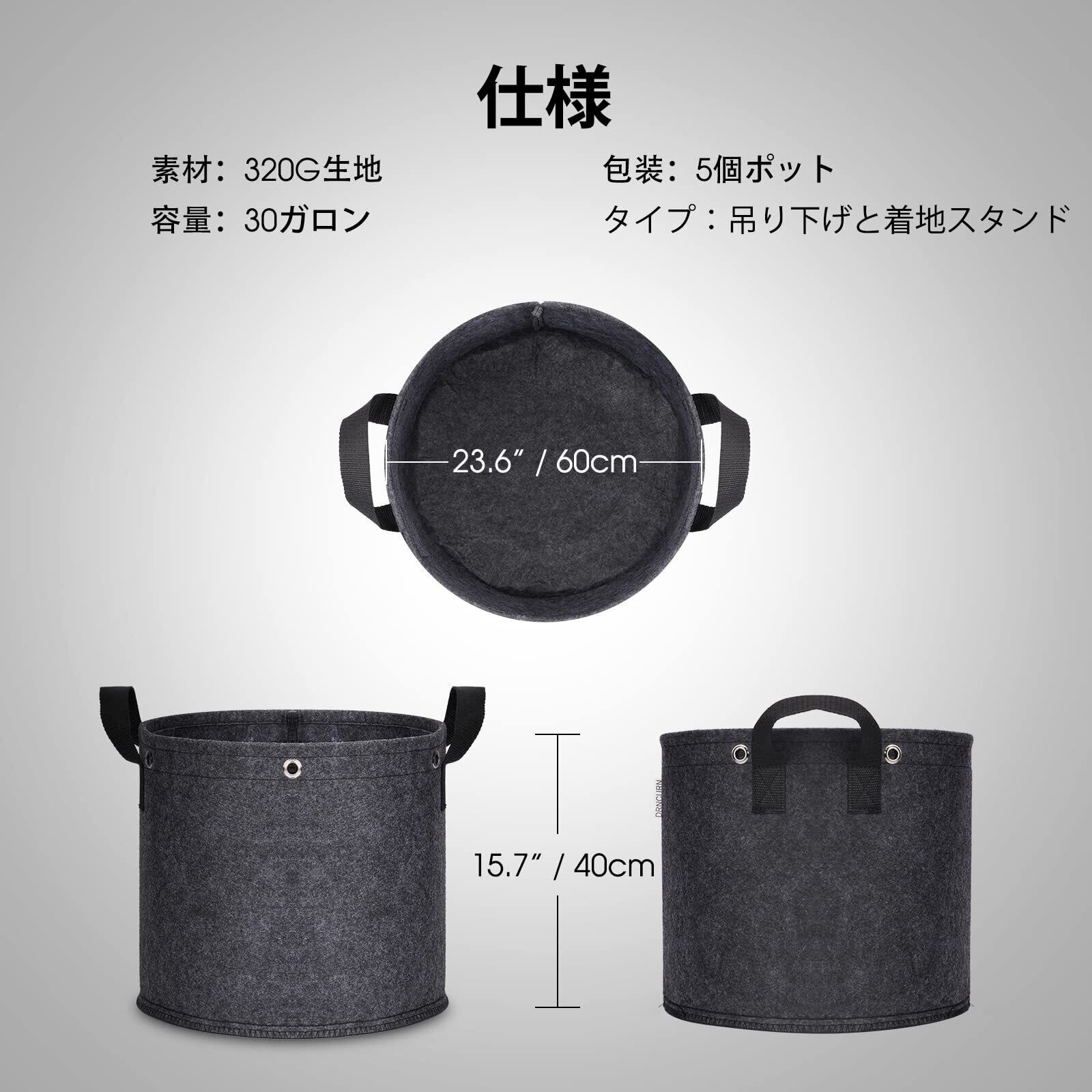 不織布 プランター 7ガロン 5枚セット ハンドル付き 320G厚手不織布ポット 植木鉢 大型 布鉢 布袋 フェルト 家庭菜園 プランター 野菜 育苗 園芸 LSTリング付き 低圧力植物訓練用 ((幅35×高30cm))