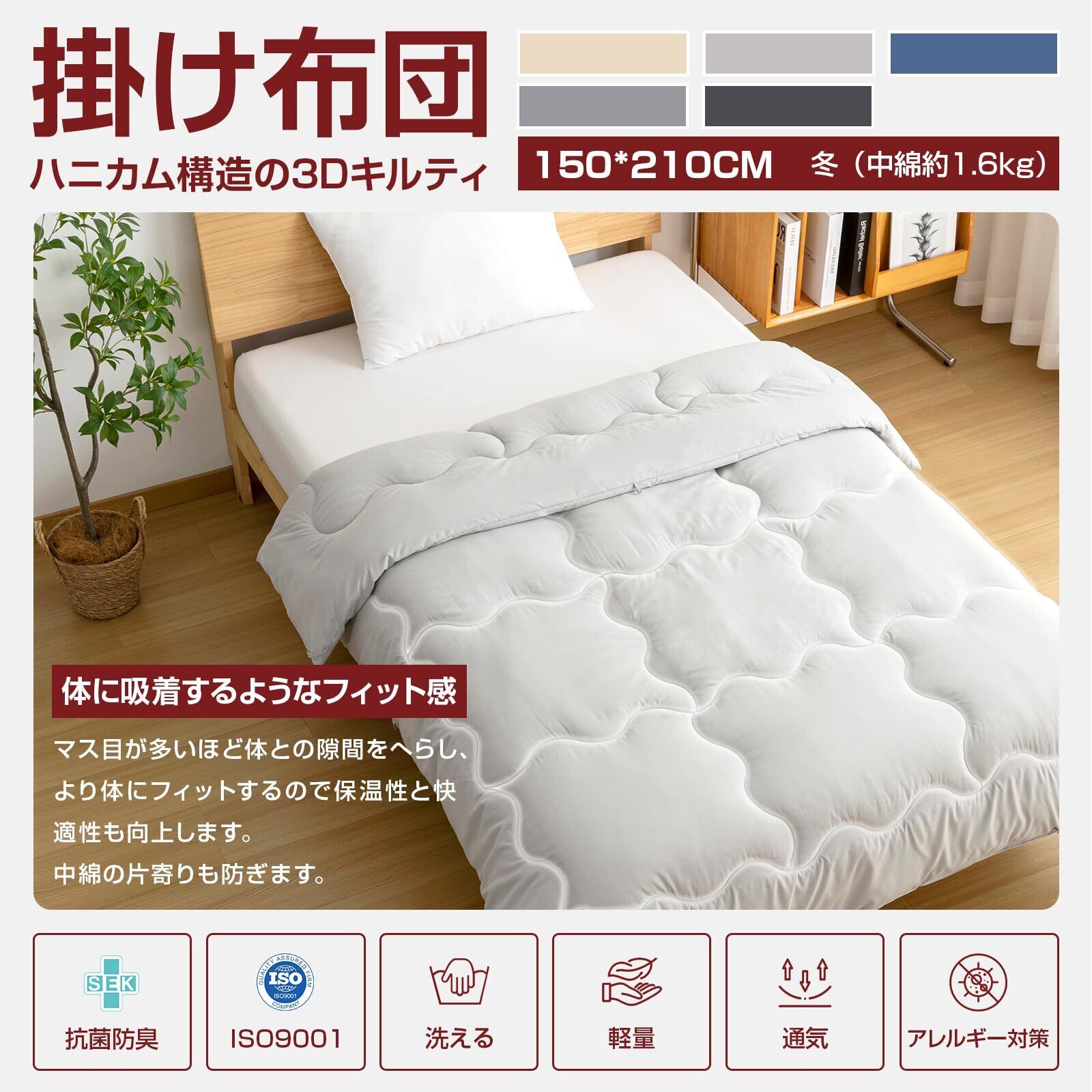 【商品仕様】掛け布団サイズ:約150x210cm(シングル掛けふとん) 側生地:ポリエステル100%(Ag+銀イオン抗菌素材) 詰め物:中空ポリエステル綿100% 軽くて持ち運びも簡単、季節を問わず長く使える掛け布団です。【8箇所ループ付き】掛けカバーと掛け布団のズレを防ぐため、8箇所にループを付けました。ずれにくく、快適にご使用できます。