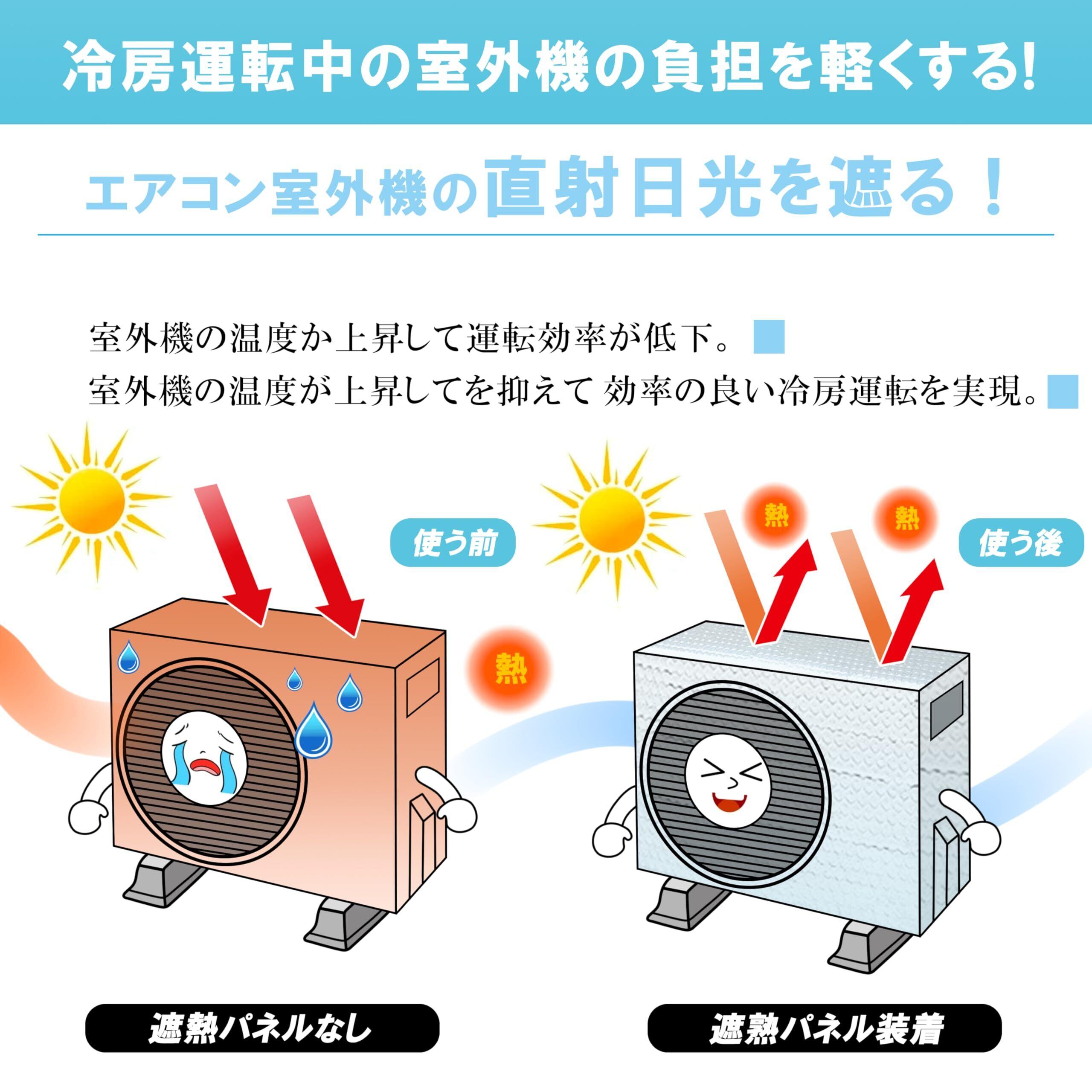 【材質】エアコン室外機カバーは光反射アルミ箔を使用し、内側に複合綿を使用しています。 室外機の破損を防ぐため、直射日光を避ける最新の反射素材を使用しています。 また、防水仕様なので雨の日でも快適に過ごせます。