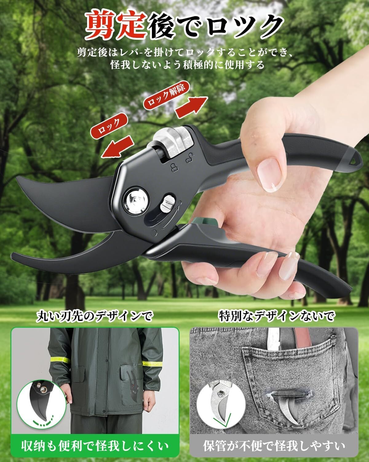 【安全ロック付き】当社の庭鋏は内蔵スプリング設計を採用しており、スプリングの脱落や剪断破壊の発生を効果的に防ぎます。安全ロックは、使用していないときにハサミが誤って開くのを効果的に防ぎ、安全を保護します。ロック設計は、怪我を避けるためにはさみを保管するのにも役立ちます。