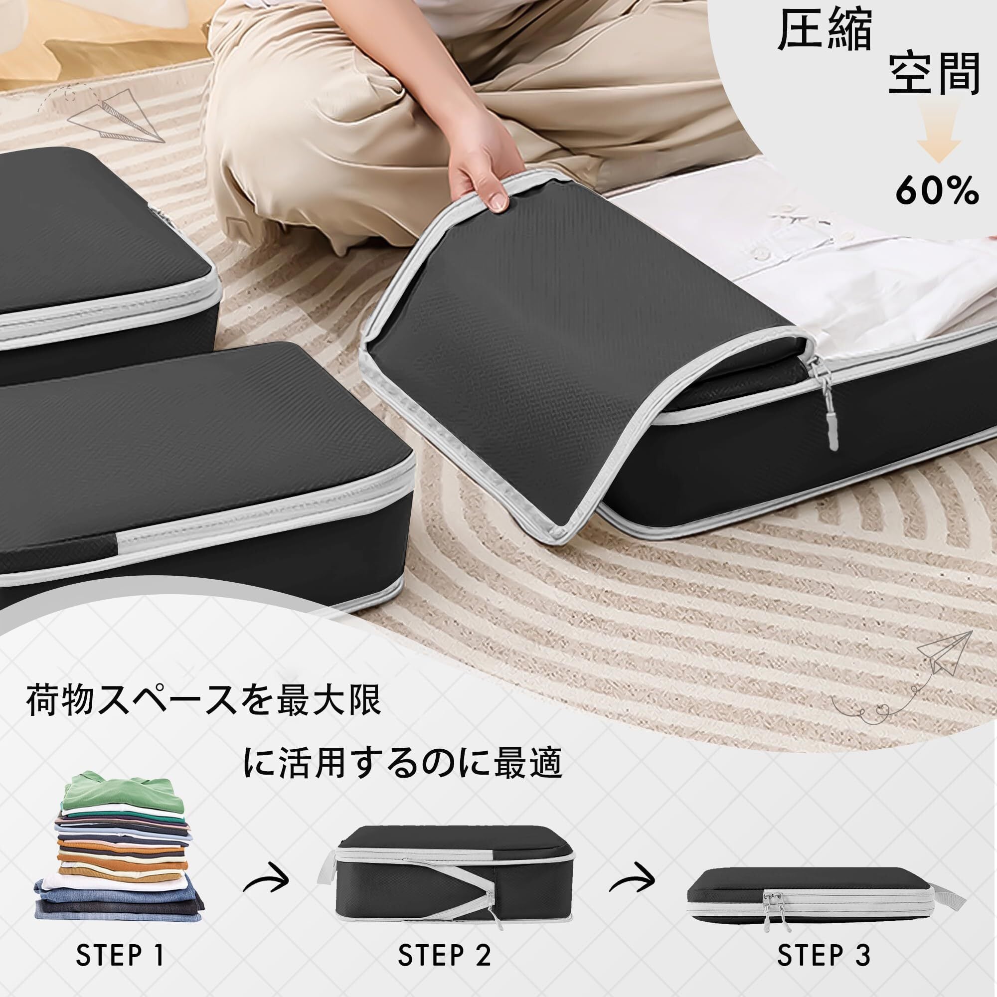 旅行用圧縮袋 【2024年最新型】トラベルポーチ 4点セット 旅行用圧縮オーガナイザー 圧縮で衣類スペース約60%節約 撥水加工 衣類仕分け 旅行、出張、温泉、海外研修に、超軽量で便利なアイテム (ブラック)