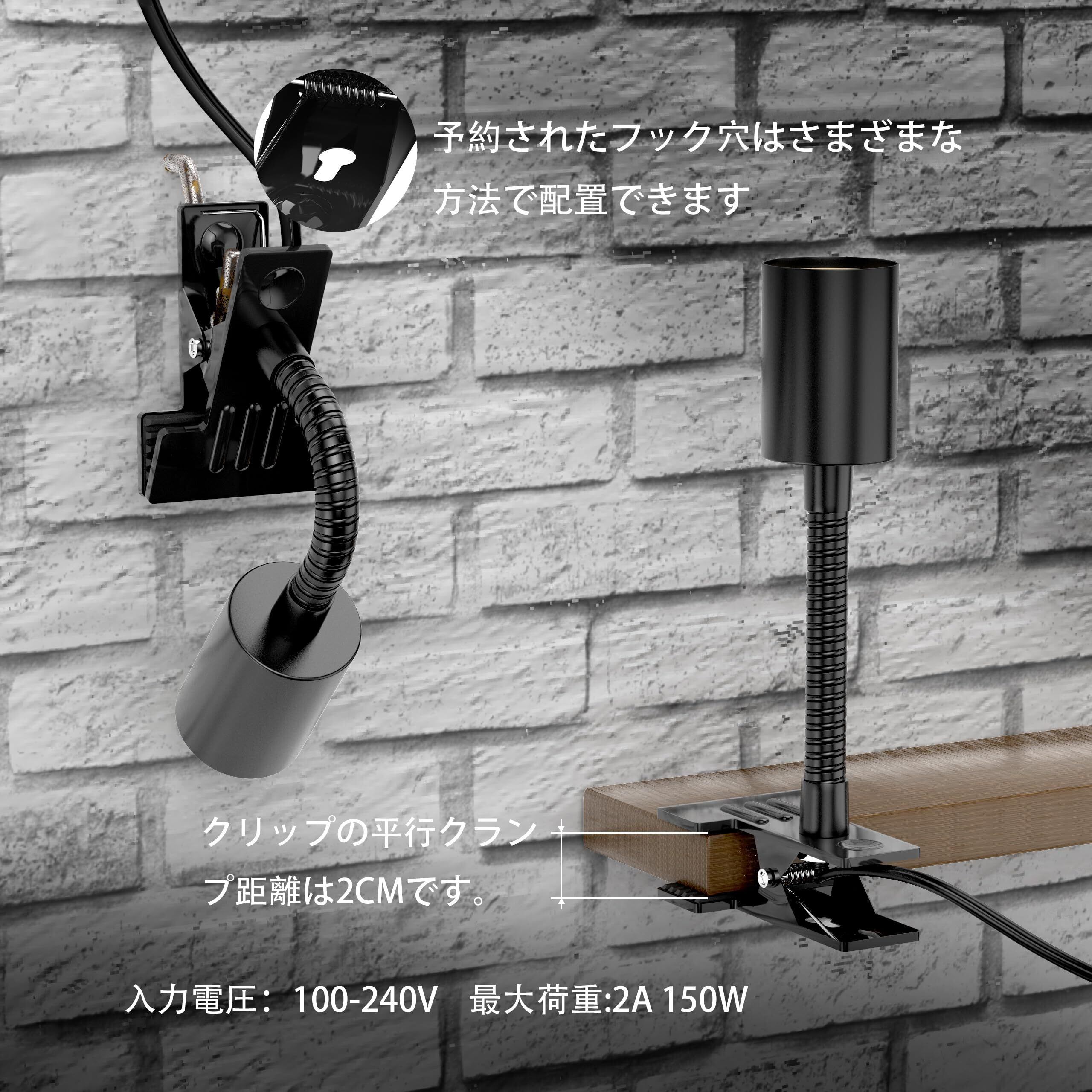 植物生長灯と家庭用照明電球に適用,E 26口金ソケットはセラミックで作られ、高温に耐えられる。最大荷重:2 A、100-240 V、50/60 Hz、クリップは最大厚さ4 CMを挟むことができ、ガチョウネックチューブは最大約350グラムを安定的に支持することができる。スイッチ線の全長は1.8 Mで、2列の0.75 mm²銅芯線材。XH-304スイッチはプラグ0.9 Mにあります。ワイヤの他端には、ガチョウの首のチューブに15 CMが被せられている。実際に使用できる線材の長さはいずれも1.65 Mである。