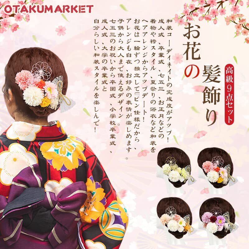 成人式や結婚式、卒業式、何気ない日常まで、幅広いシーンで活躍すること間違いありません。お友達やご家族との特別な時間をより素敵なものにするため、[OTAKUMARKET]の髪飾り9点セットをぜひお試しください。この機会に、あなたのスタイルを華やかに彩るアイテムとしておすすめです!