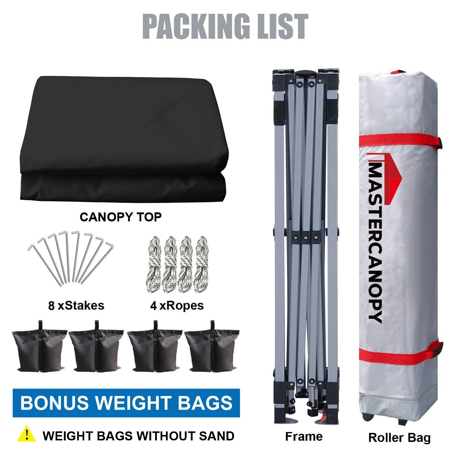 [マスターキャノピー(MASTERCANOPY)ワンタッチタープテント 2M/2.5M/3M 三段階調節 スチールフレーム 風抜けベンチレーション 耐水 UVカット サンシェード 日除け 商用 アウトドア用(キャスターバッグ ペグ ロープ ウェイトバッグ付き)(2.5M,黒)]