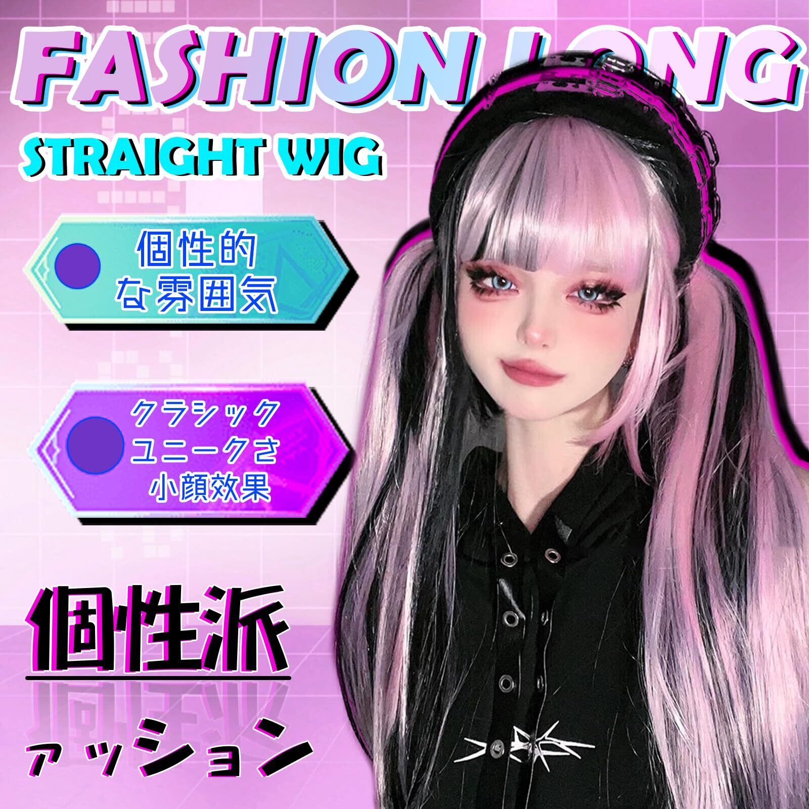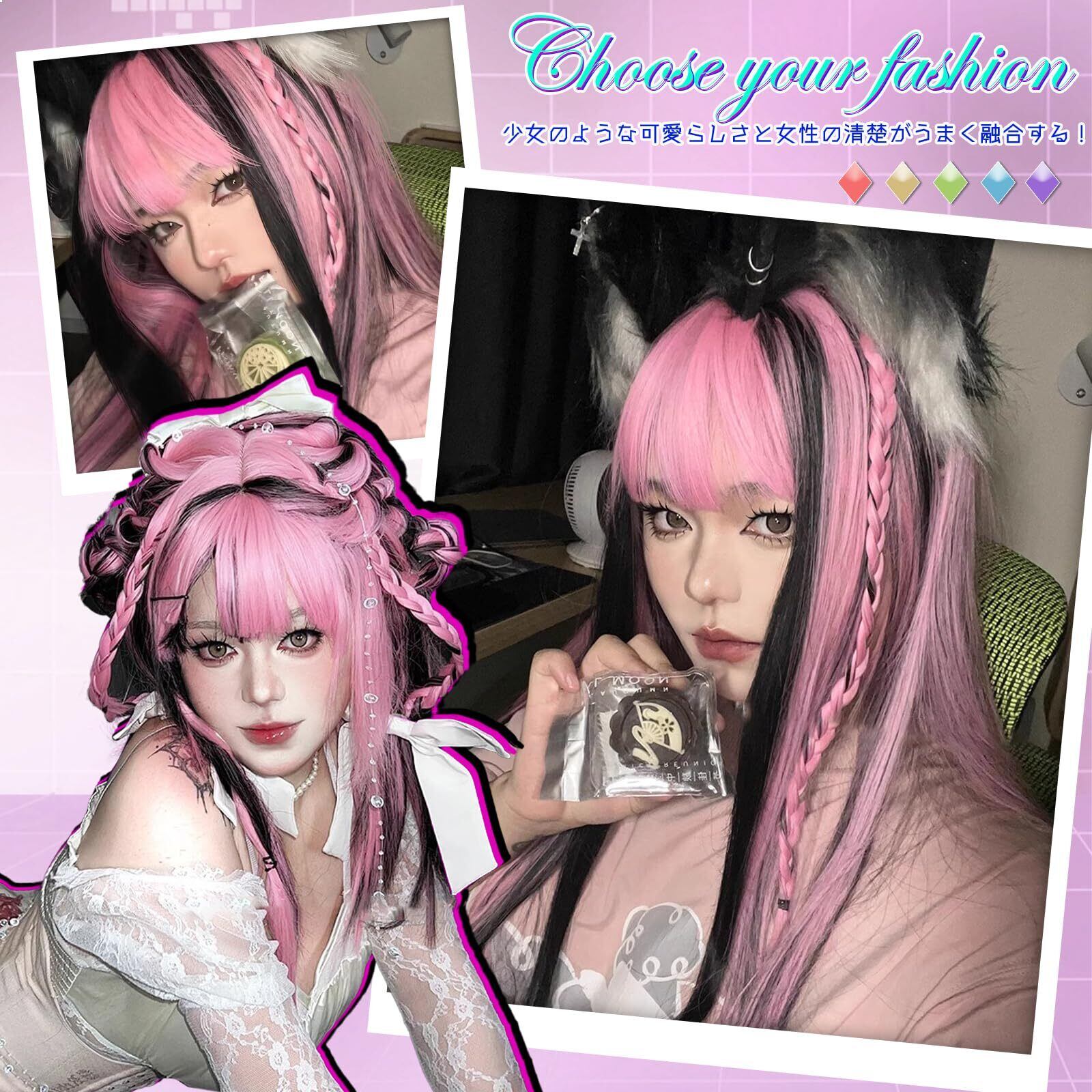 [Hawkko] ウィッグ ロング ストレート 姫カット フルウィッグ インナーカラー さくらピンク+ブラック