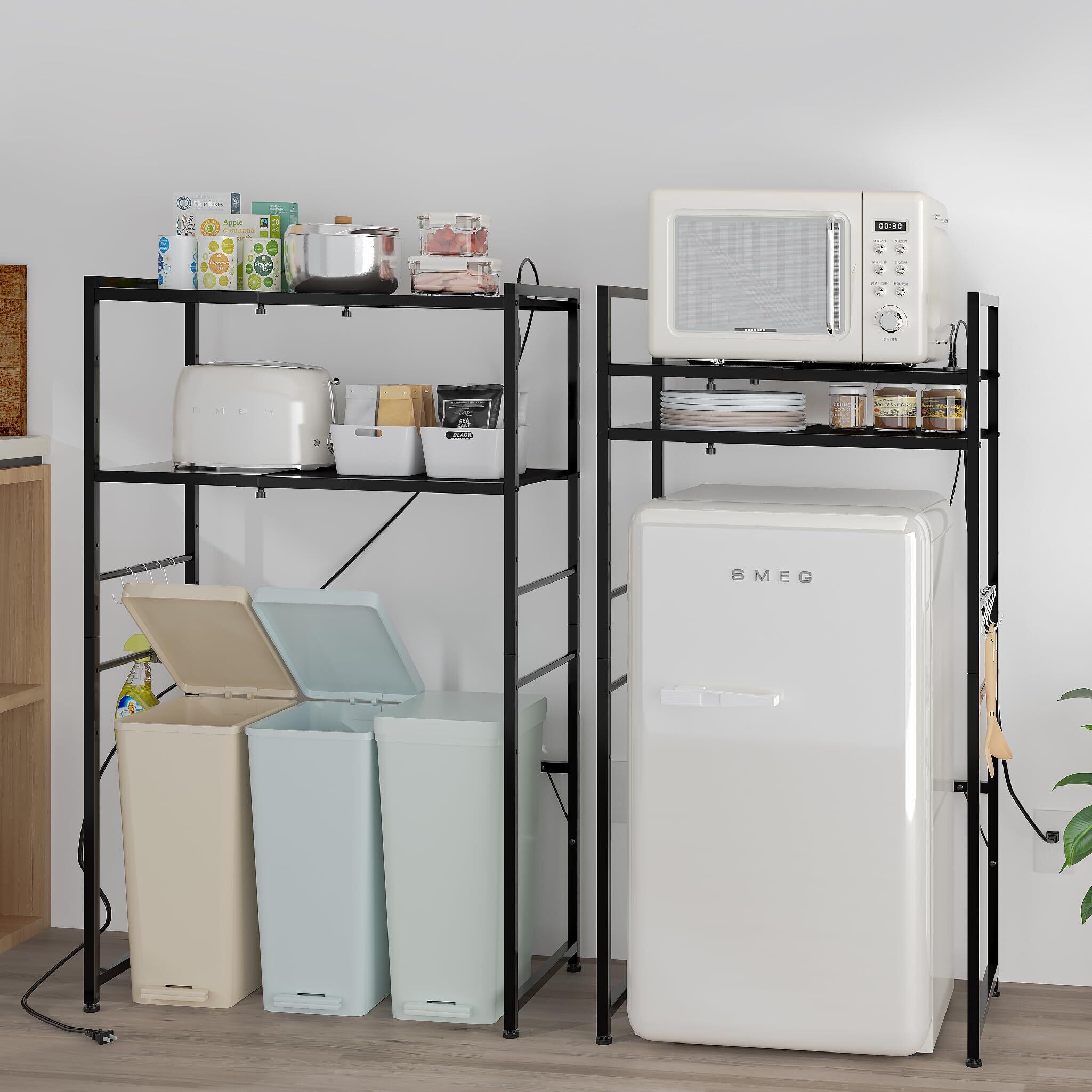 LunarLight ゴミ箱上ラック 幅60.5-80奥行42高さ129.5cm 多機能横幅伸縮 コンセント付きキッチンベイカーラック キッチンラック レンジ台 オーペンラック ゴミ箱収納 プリンター台 可動式棚板多段調節 S字フック付き 総荷重70kg 錆び防止 耐摩擦性 耐水性 耐熱性機能 (ブラック) | Bloomia