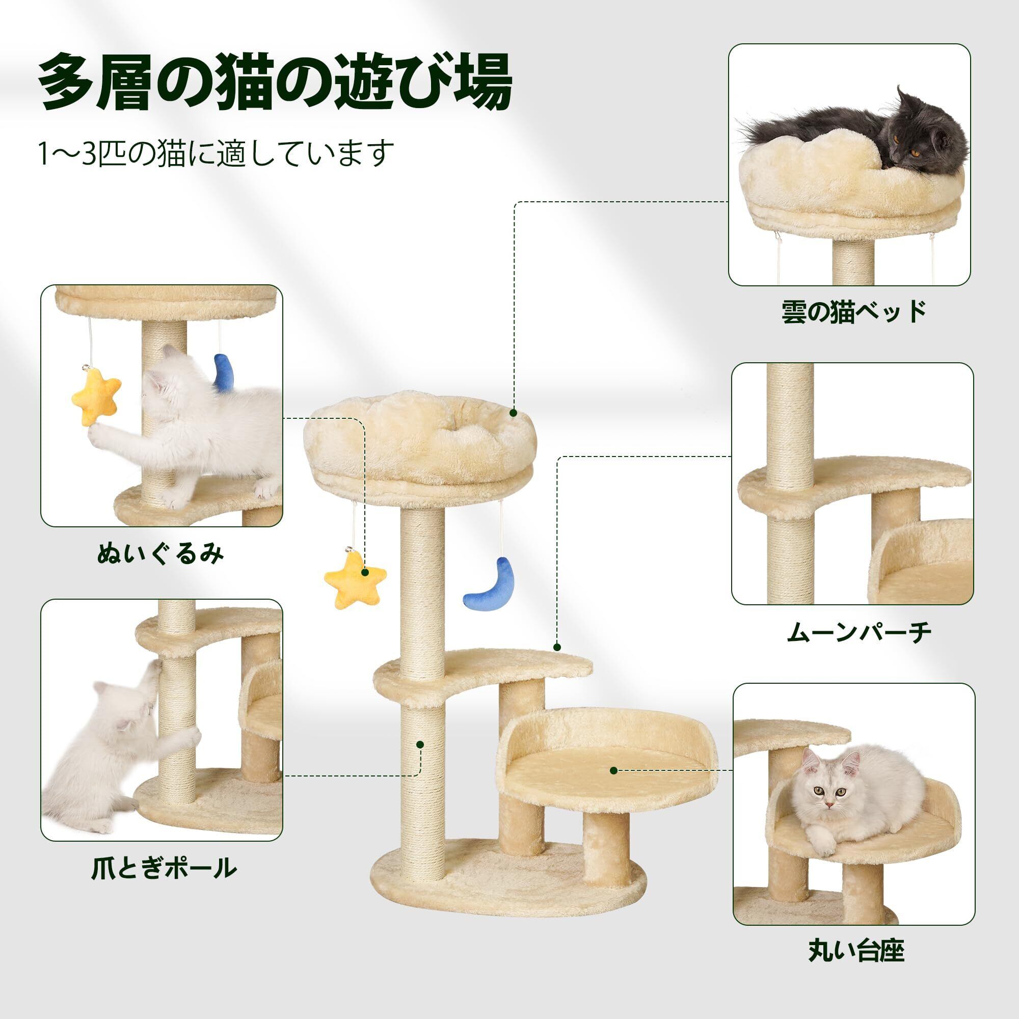 仔猫用 キャットタワー ミニ 雲型デザイン (6ヶ月以下/体重4kg未満対応) 省スペース 爪研ぎ付き 組み立て簡単 おしゃれ猫タワー ブラック 高さ62cm ベージュ
