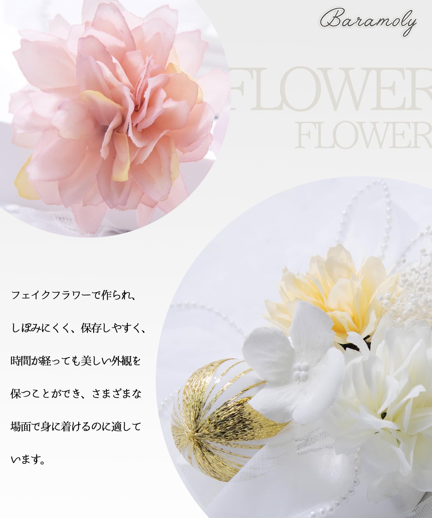 [Baramoly] 髪飾り 成人式 卒業式 結婚式 発表会 七五三 花 チュールリボン リボン 小さい花 組紐 ホワイトパール 和玉 かすみ草 フェイクフラワー 金箔 水引 金箔 和玉 和装 着物 留袖 振袖 浴衣 袴 [RA016]