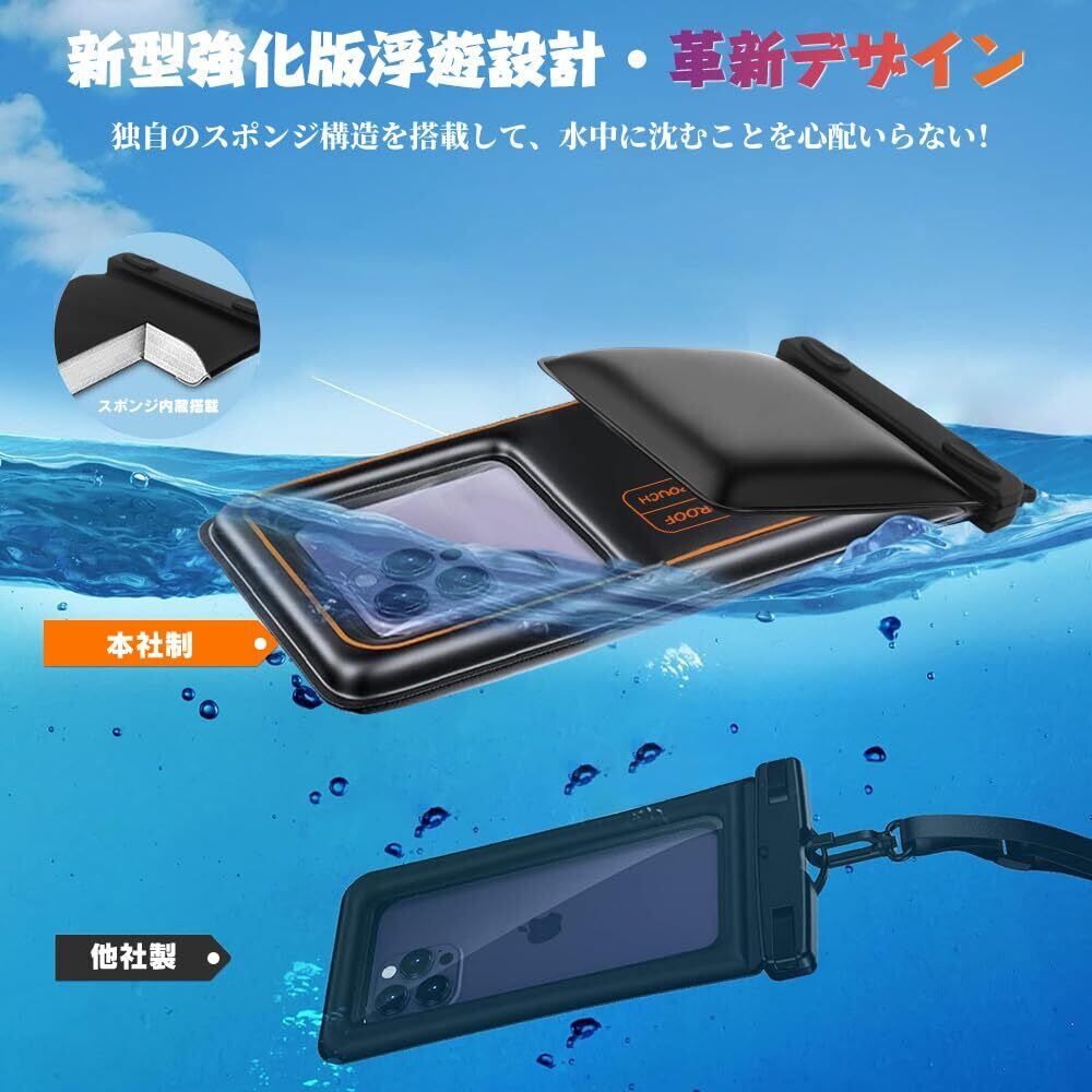 ❀【紛失・衝撃に安全対策!スポンジ素材で浮遊感抜群】従来品と違っての携帯防水ケースは最新改良の側面浮き輪デザインを採用し紛失対策&耐衝撃性&浮力がアップ!通常の防水カバーよりも耐衝撃性に優れています。フローティング構造が落下などの衝撃を分散・吸収して本体に伝えなくなり、高い耐衝撃性を誇り、スマホを全方位からしっかりと守ります。または背面に水に浮くふわふわの「スポンジ」設計を搭載して、浮力がより向上し、水中に沈むことを心配することはないです。市販の普通浮き防水ケースの約2倍と強力!※本製品の浮力受容範囲は約400gくらいです。 受容範囲を超えると沈む可能性があるため、ご使用前にご確認をお願いします。※水中の場合に、水圧のためタッチパネル操作に影響を与える可能性があるので、物理的なボタンを使うことをお勧めします。