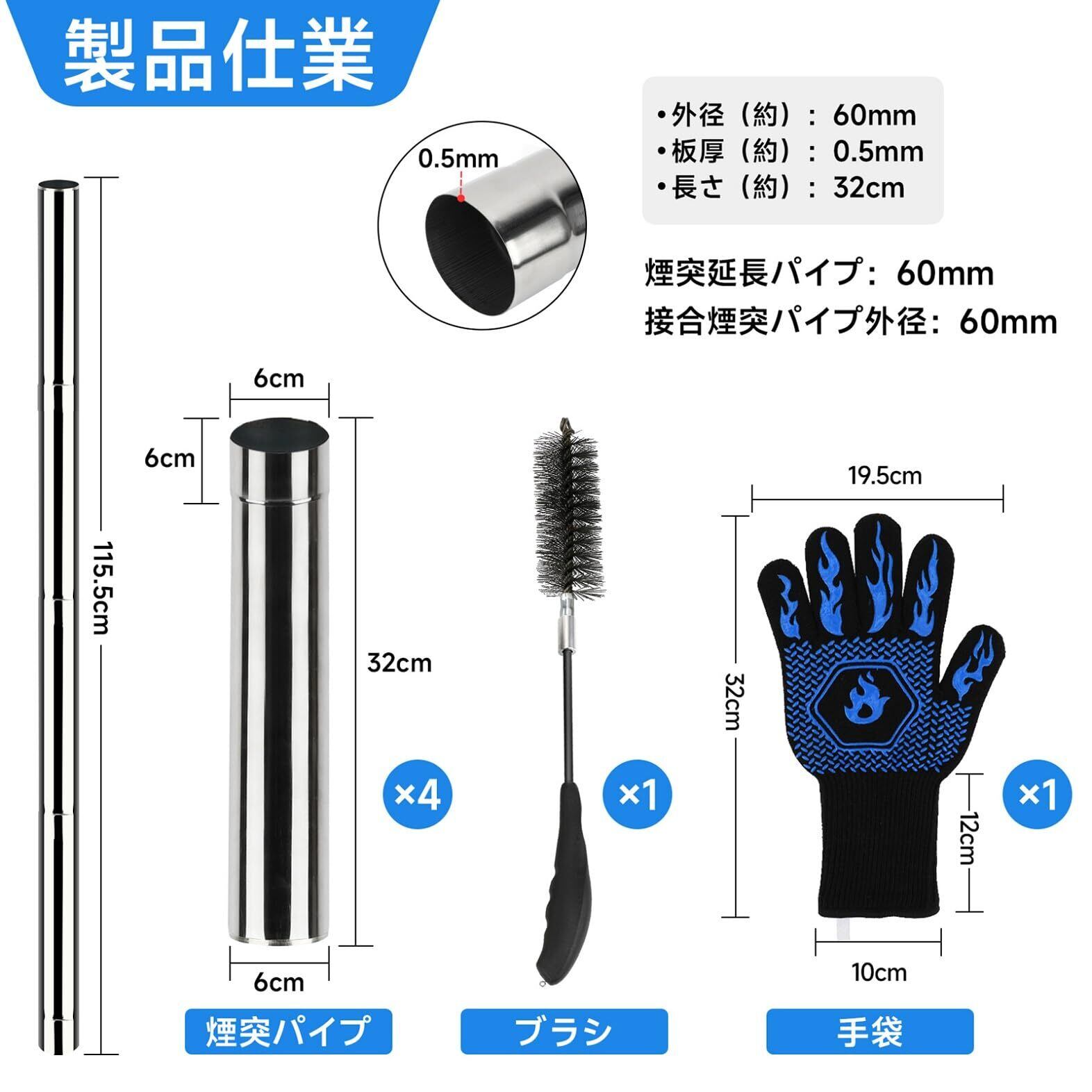 【製品仕様】サイズ:約直径60mm×長さ320mm×厚さ0.5mm、素材:ステンレススチール、セット内容:薪ストーブ用の延長煙突(4本)と、清掃用ブラシ(1本)、ブルーの耐熱グローブ片手の合計6点セットです。