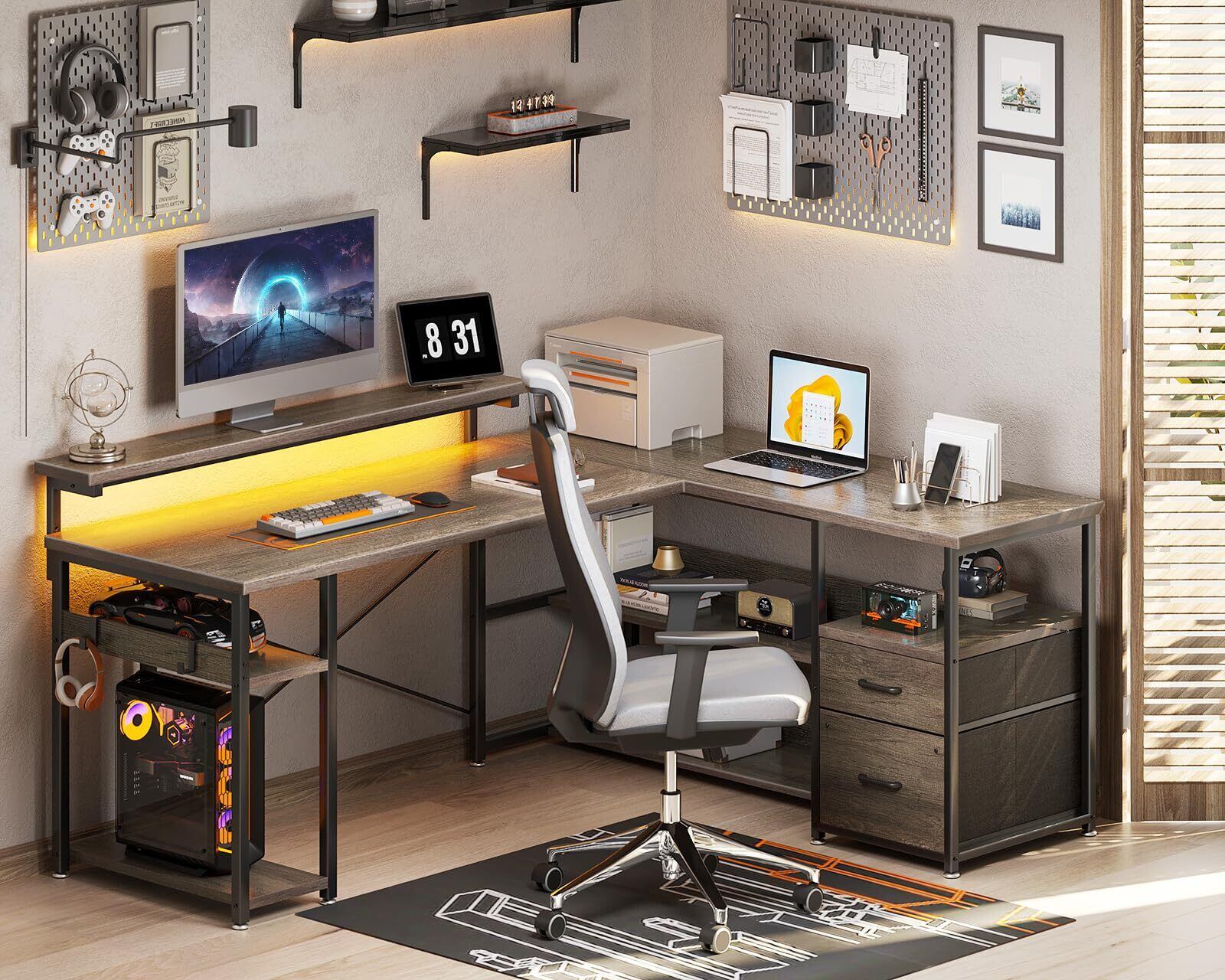 【引き出し付きデスク・収納力満載】デスクの足元には一体型の引き出しとラックが備え、本や書類などを使いたい時にサッと取り出せます。たっぷりの収納でデスク周りをスッキリ快適に!また、L字型のデザインで部屋のコーナーを最大限に活用でき、ご家庭でもオフィスでも、日常の仕事に十分なスペースを確保できます。