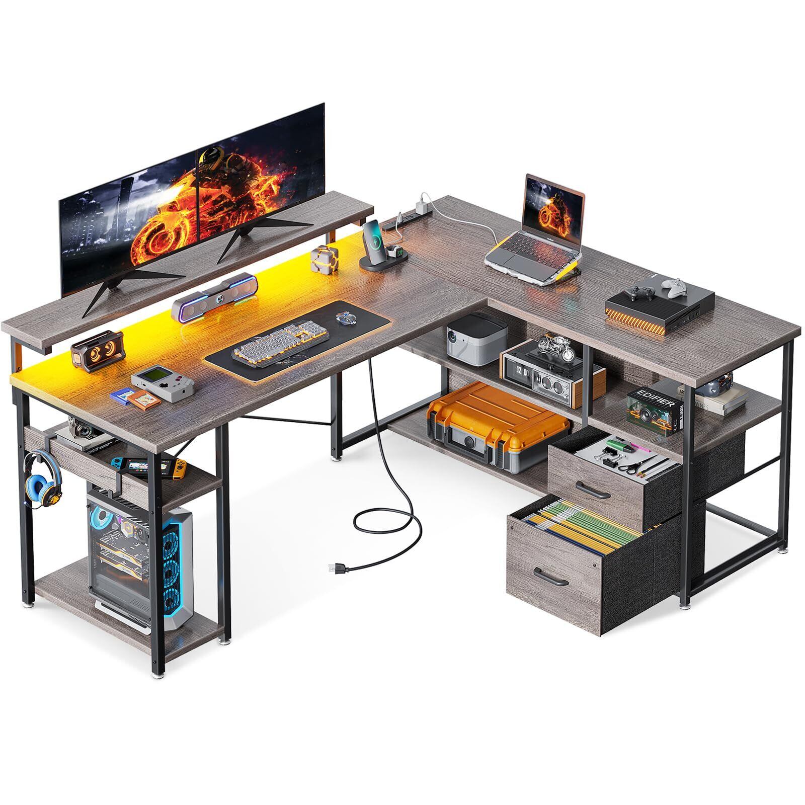 ODK パソコンデスク 引き出し2杯付き ゲーミングデスク コンセント付き l字デスク デスク 机 幅135cm 棚付き pcデスク 収納 オフィスデスク 仕事用 在宅勤務 組立簡単 グレー | Bloomia