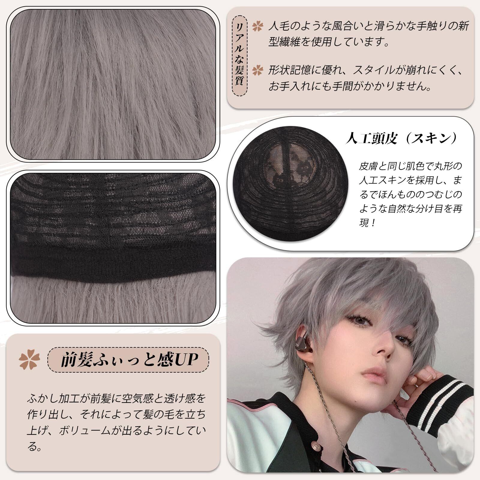 FESHFEN ウィッグ かつら メンズ ウルフ 黒髪 男性 フルウィッグ ウルフカット 男装 黒 ショート ハンサム 普段使い ゆるふわ ファッション イケメン 原宿 自然 男女兼用 耐熱 人気 ファッション ふわふわ 短髪 ネット/櫛付き ダークグレー