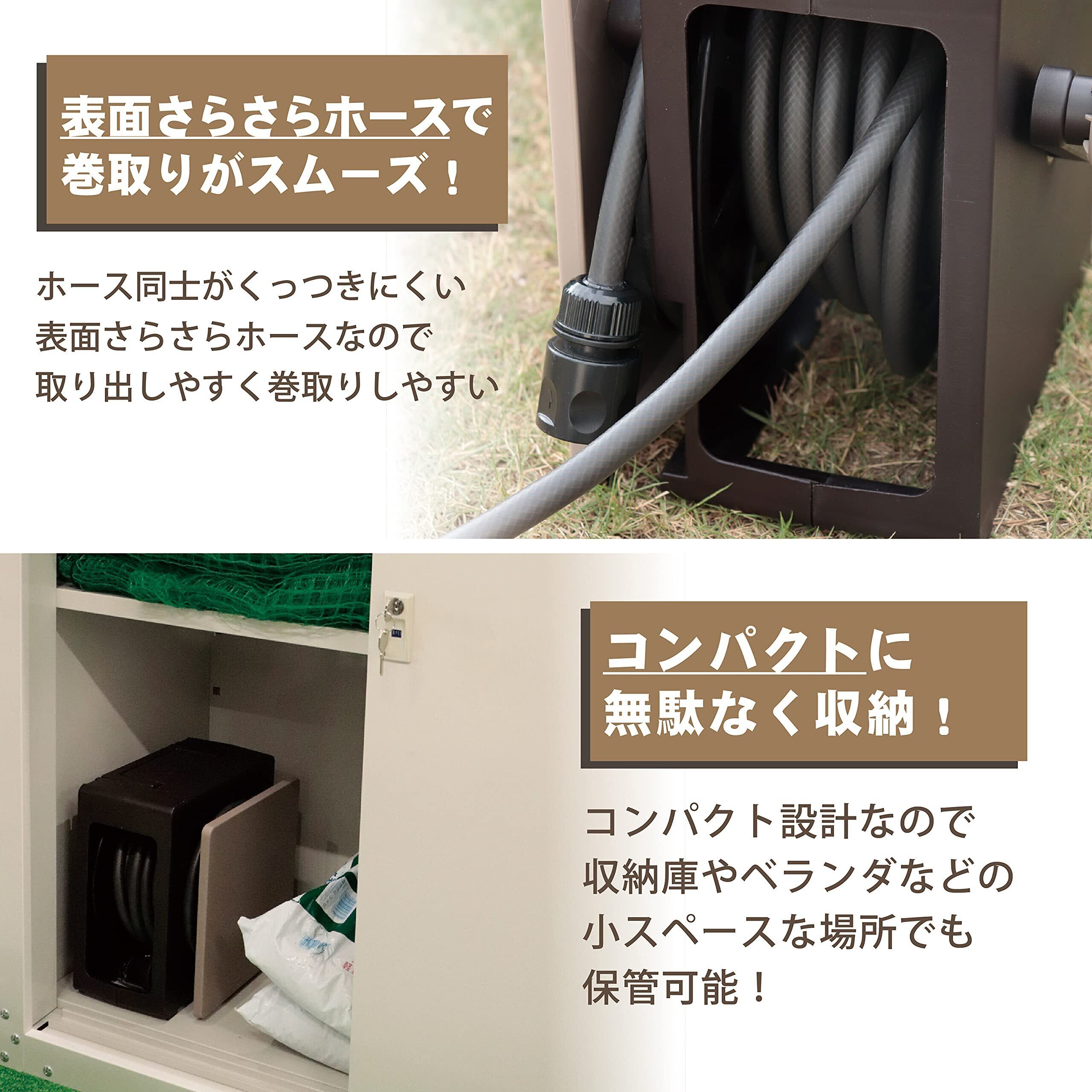ブラウン・ベージュ色の外観を乱さないカラーリングで、9mmホースの中で業界最小のコンパクトホースリールです。
