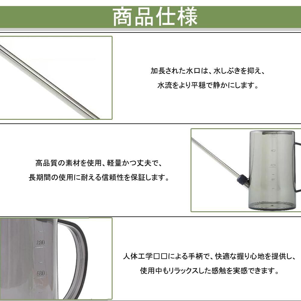 質の高い材料:ステンレスの長いパイプは耐久性と防錆性を確保し、高品質な透明な素材で作られたジョウロは高い透明度と耐破損性を持ち、長期間使用しても安心です。