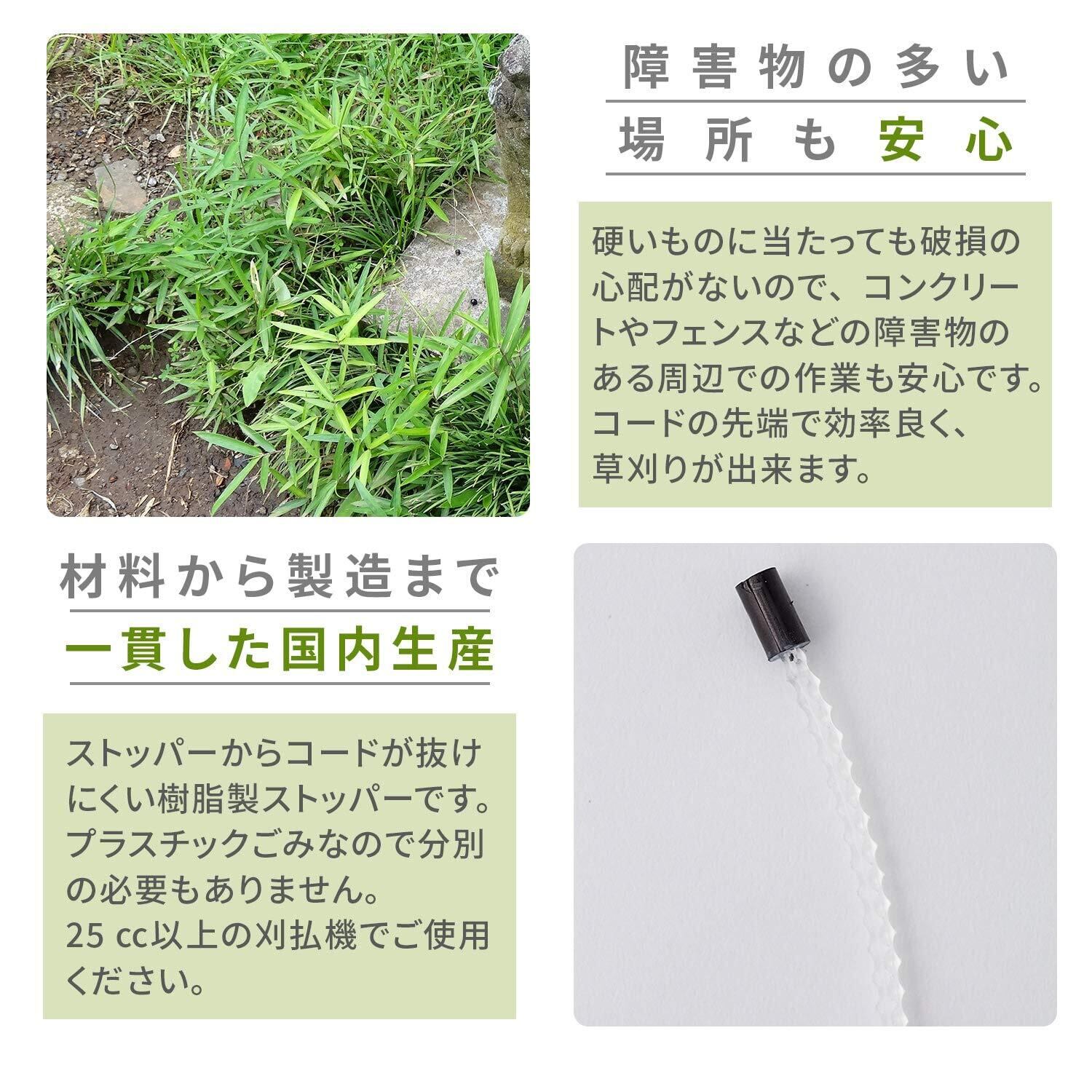 【特徴】硬い草もラクラク切断可能なナイロンコードです。四方にノコギリ形状の刃を出すことで切れ味抜群!硬い草もラクラク破断します。先細りしない新形状で、最高の刈り心地が持続します。25㏄以上の刈払機でご使用ください。破断力はそのままに、もたつきを軽減します。硬いものに当たっても破損の心配がないので、コンクリートやフェンスなどの障害物のある周辺での作業も安心です。コードの先端で効率良く、草刈りが出来ます。ストッパーからコードが抜けにくい樹脂製ストッパーです。プラスチックごみなので分別の必要もありません。