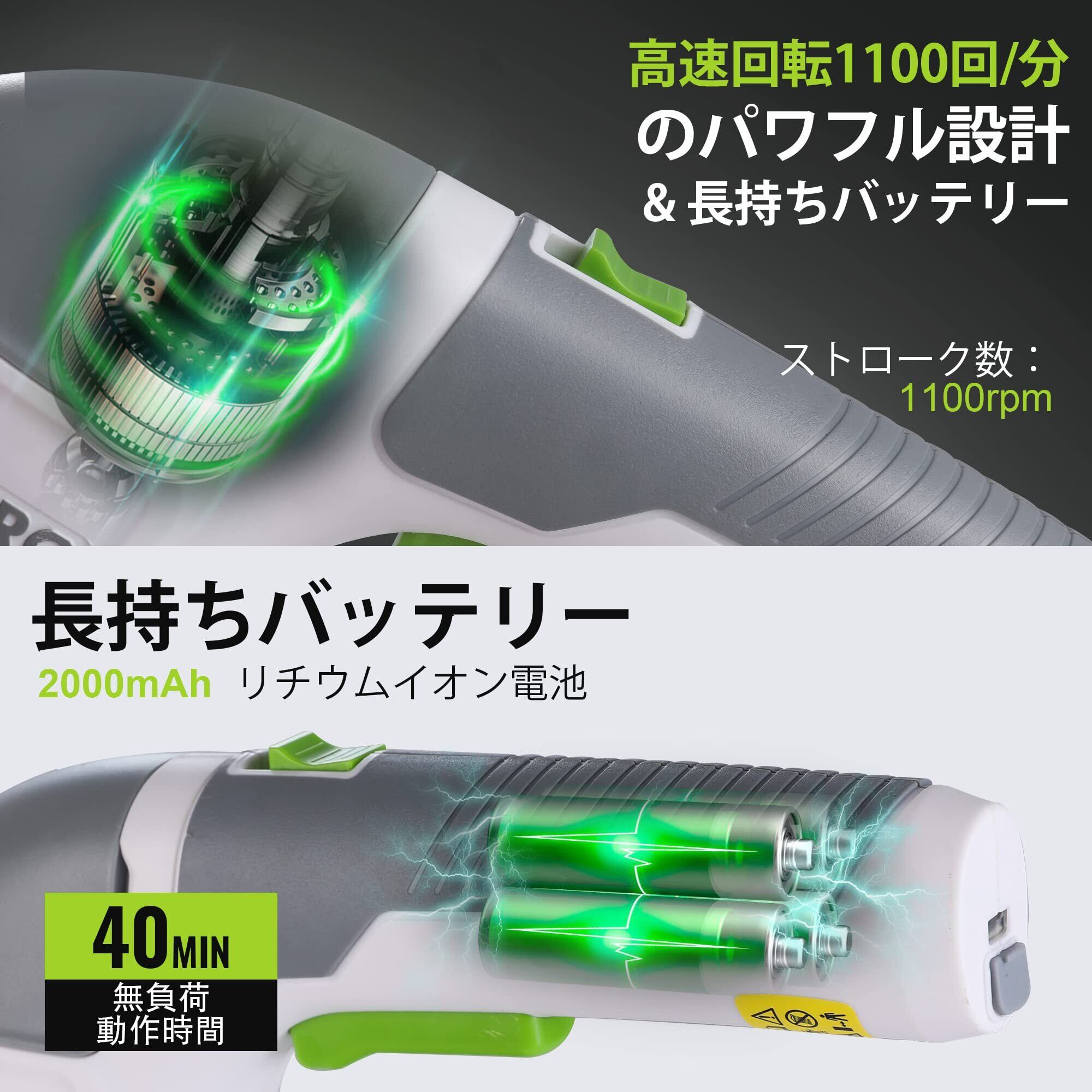 【Type-C・3.6V usb充電式】コードレスタイプなので、コードが絡まったりひっかかる心配もなく、様々な場所で使用できます。USBケーブル(Type-C充電ポート)が付いて、ノートPC、車載充電などに対応充電できます。それに、普通の市販されているアタプター(5V/1A)にも接続して、充電ができるので便利です。フル充電の時間は約2-3時間です。充電が完了するとインジケーターライトが緑色に点灯します。ストローク数は一分1100回、剪定の効率が向上になります。3.6V強力バッテリに全新進化、無負荷運転時間40分使用可能になります。 ご注意:USBケーブルに接続する市販されている出力5V/2Aアタプターをご利用してくださいませ、アダプター出力5V/1Aではない場合、過電圧保護が反応します。出力電圧が過電圧保護動作値(アダプター出力5V/1A)を超えた際に、過電圧保護回路が動作し、出力を停止させ、充電ができなくなります。